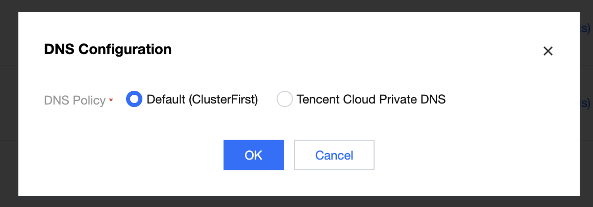 3. In DNS configuration, select DNS policy as Tencent Cloud Private DNS. Click confirm to restart the resource group.