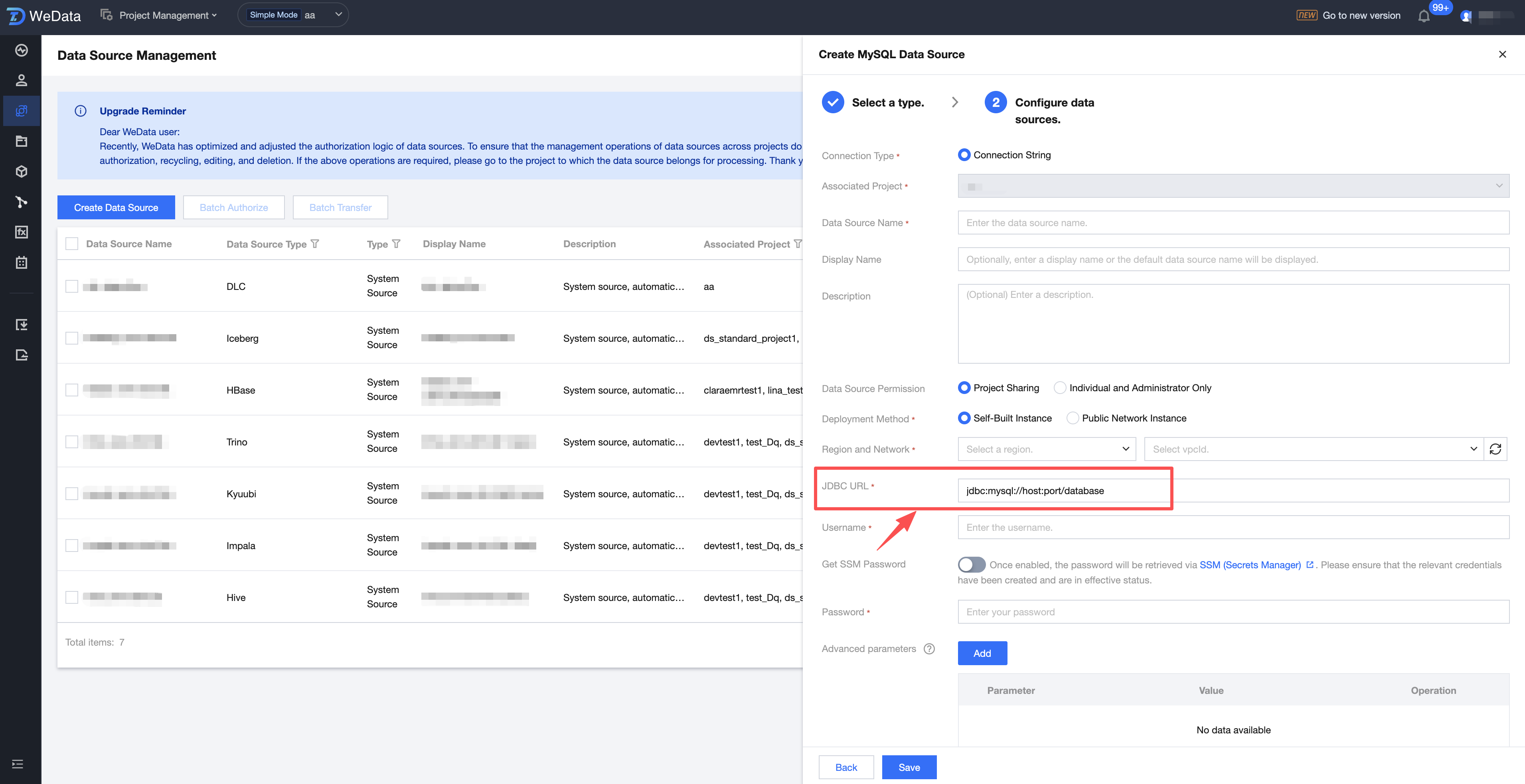 4. In project management > data source management, create a data source. You can input domain in JDBC URL.