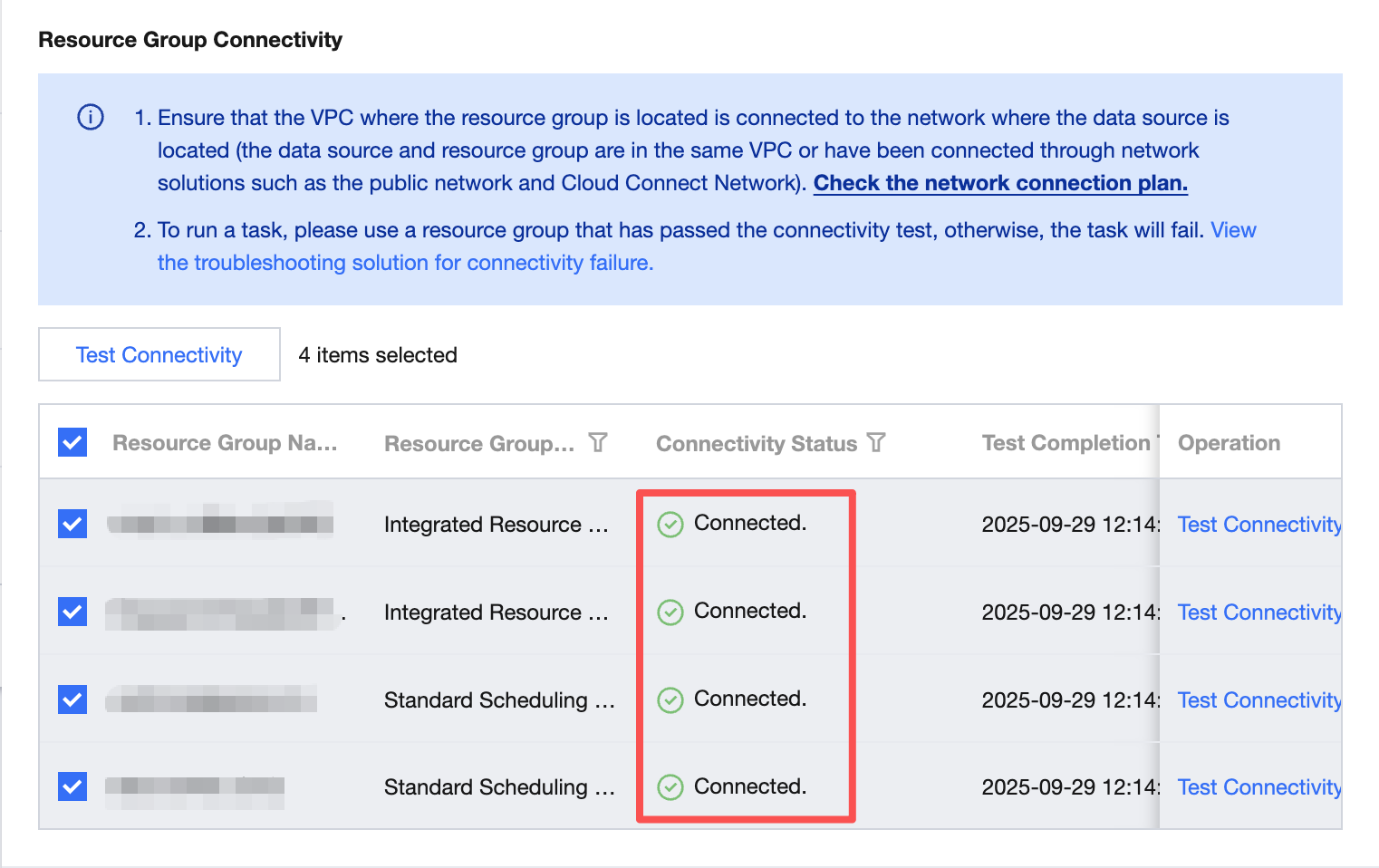 5. When testing connectivity, you can test the connectivity between scheduling resource groups, integration resource groups, and data sources. If resolution records for related domains are configured in Private DNS, the connection will be successful.