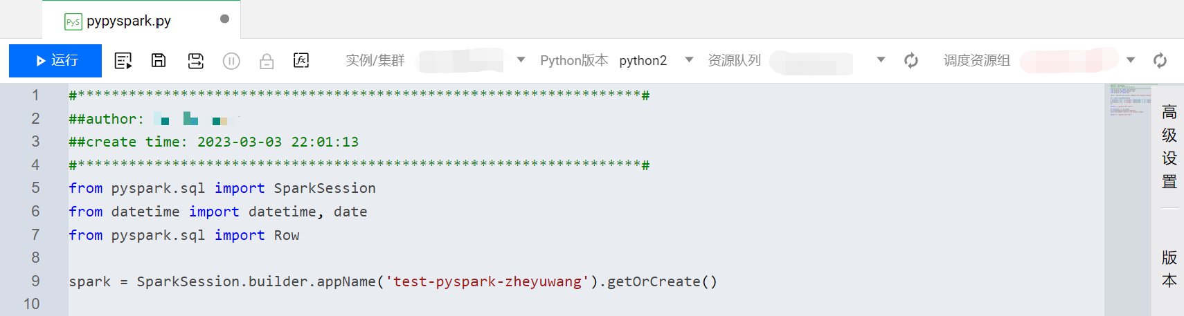 The suffix of PySpark files is ".py". Supports creating and importing. Used for online development of Python files. Supports writing Spark applications through Python. Supports execution, advanced execution, viewing and referencing project variables, editing and saving. Versions support Python2 and Python3.