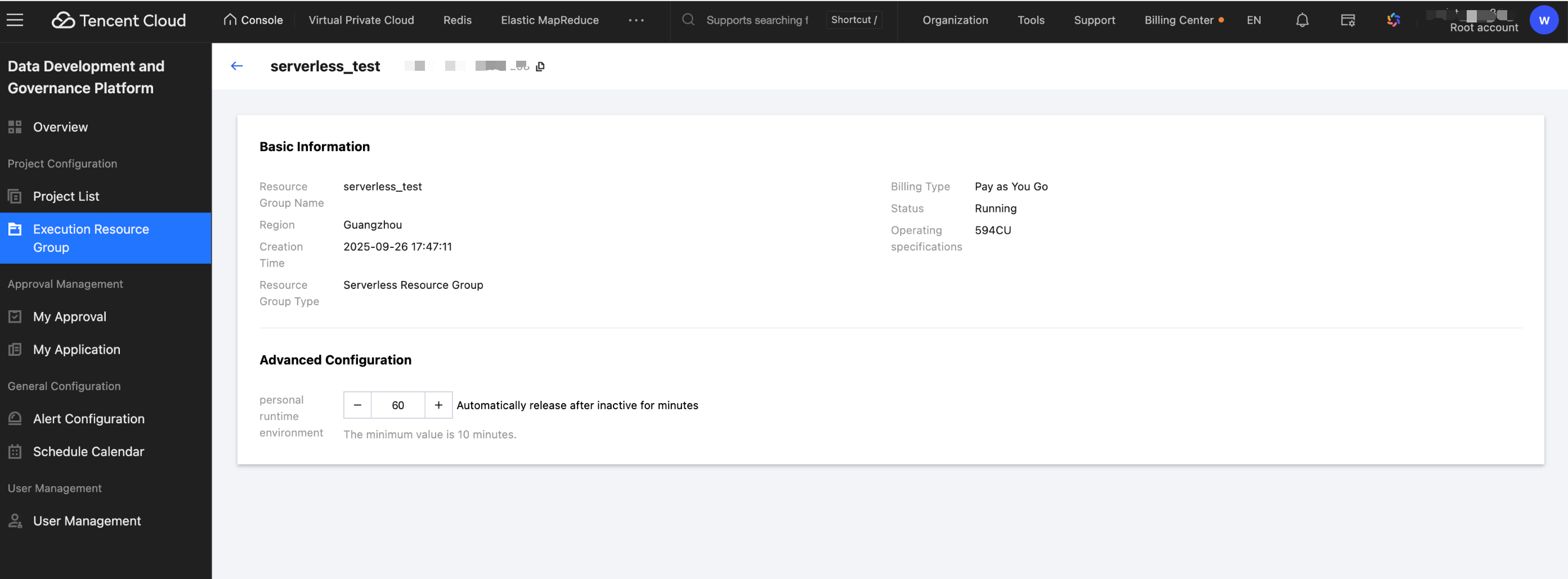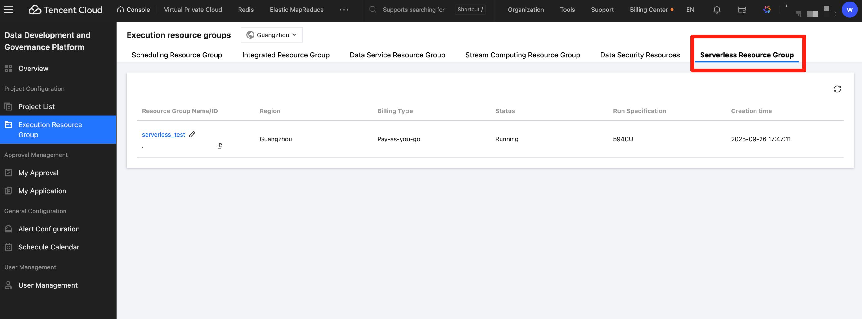 After creation, all existing projects in the current region are automatically associated with the Serverless resource group.