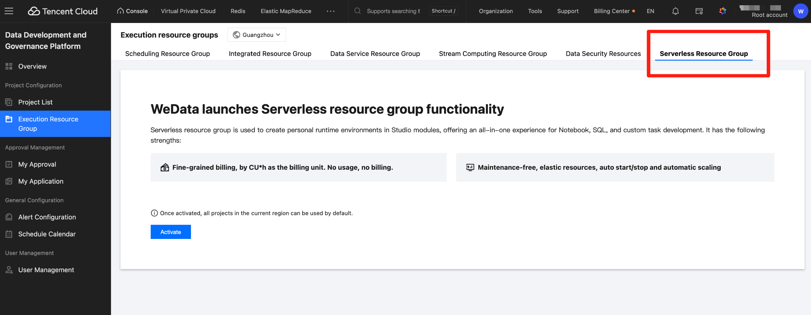 Enter the WeData Console, click Execution Resource Group > Serverless Resource Group, go to the resource group creation webpage, and click one-click activation to create a Serverless resource group. Creating a Description
