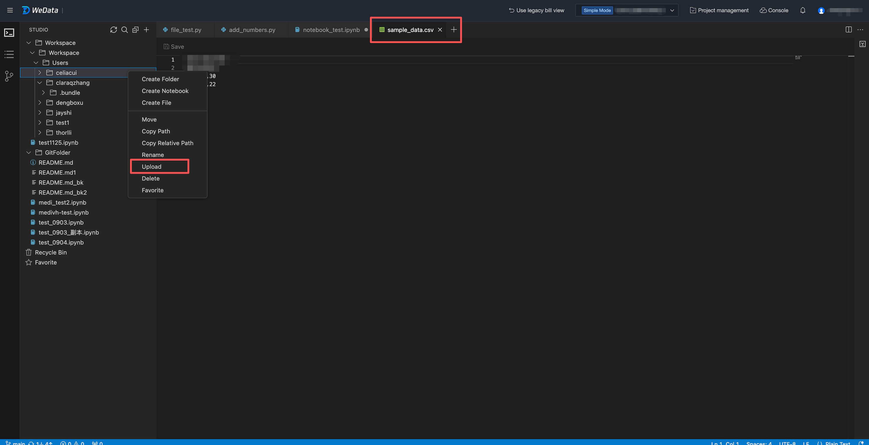 1. Click folder > upload to upload the CSV file you need to use to the directory.