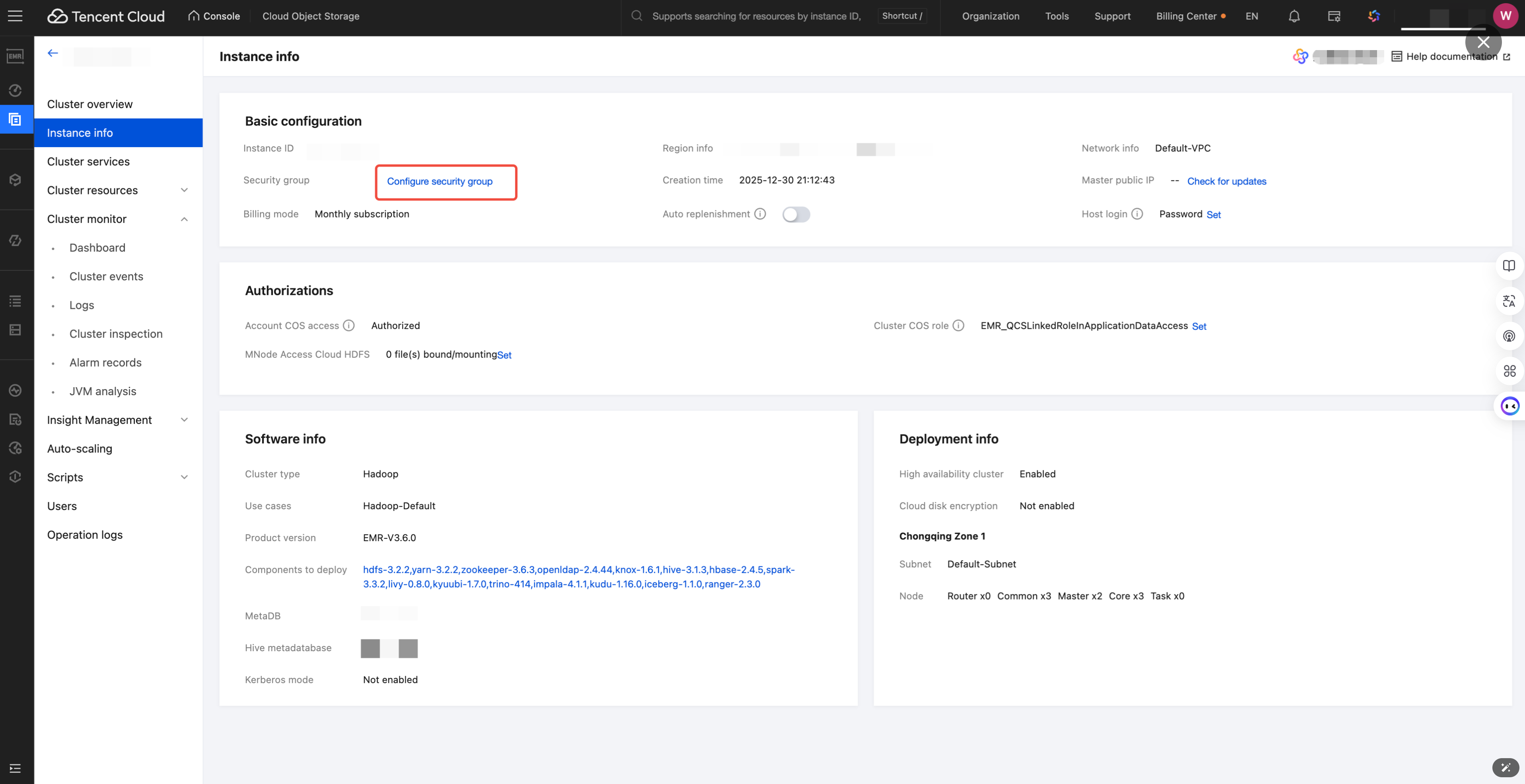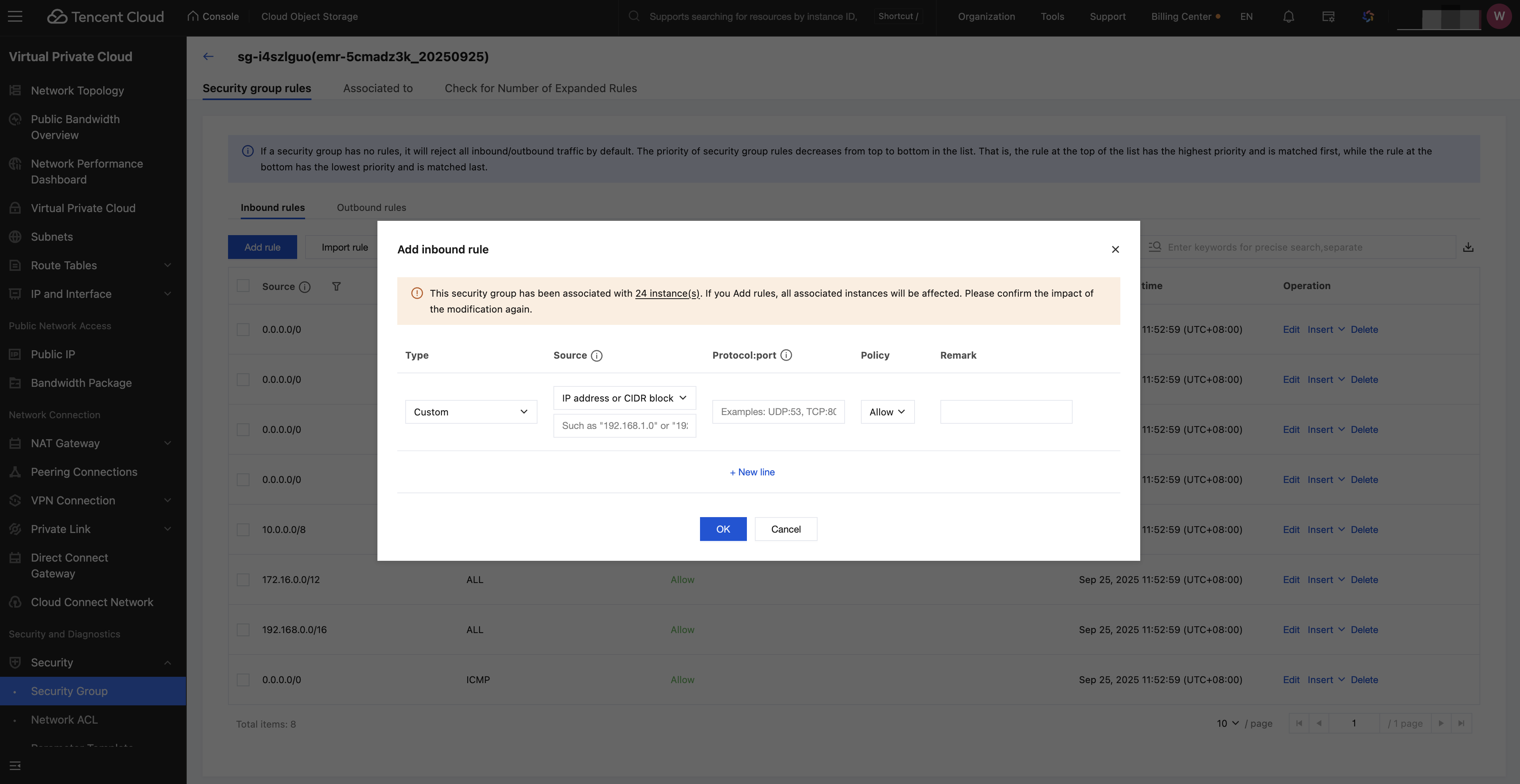 For the initial use of the EMR engine in WeData Studio, you need to check if the security group used by EMR allows access to the WeData Studio network segment (30.22.32.0/19). If not, perform the following operations on the security group: