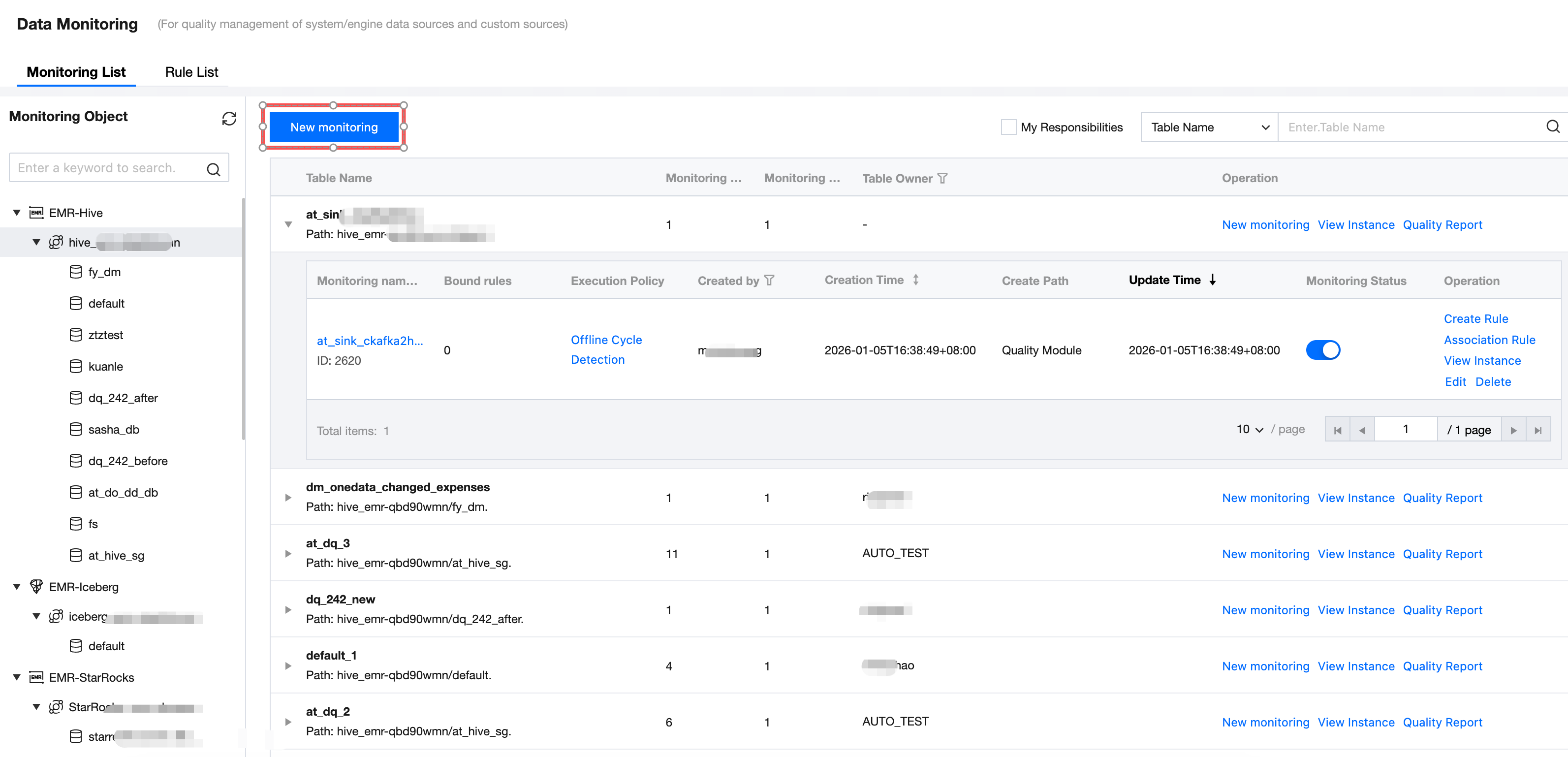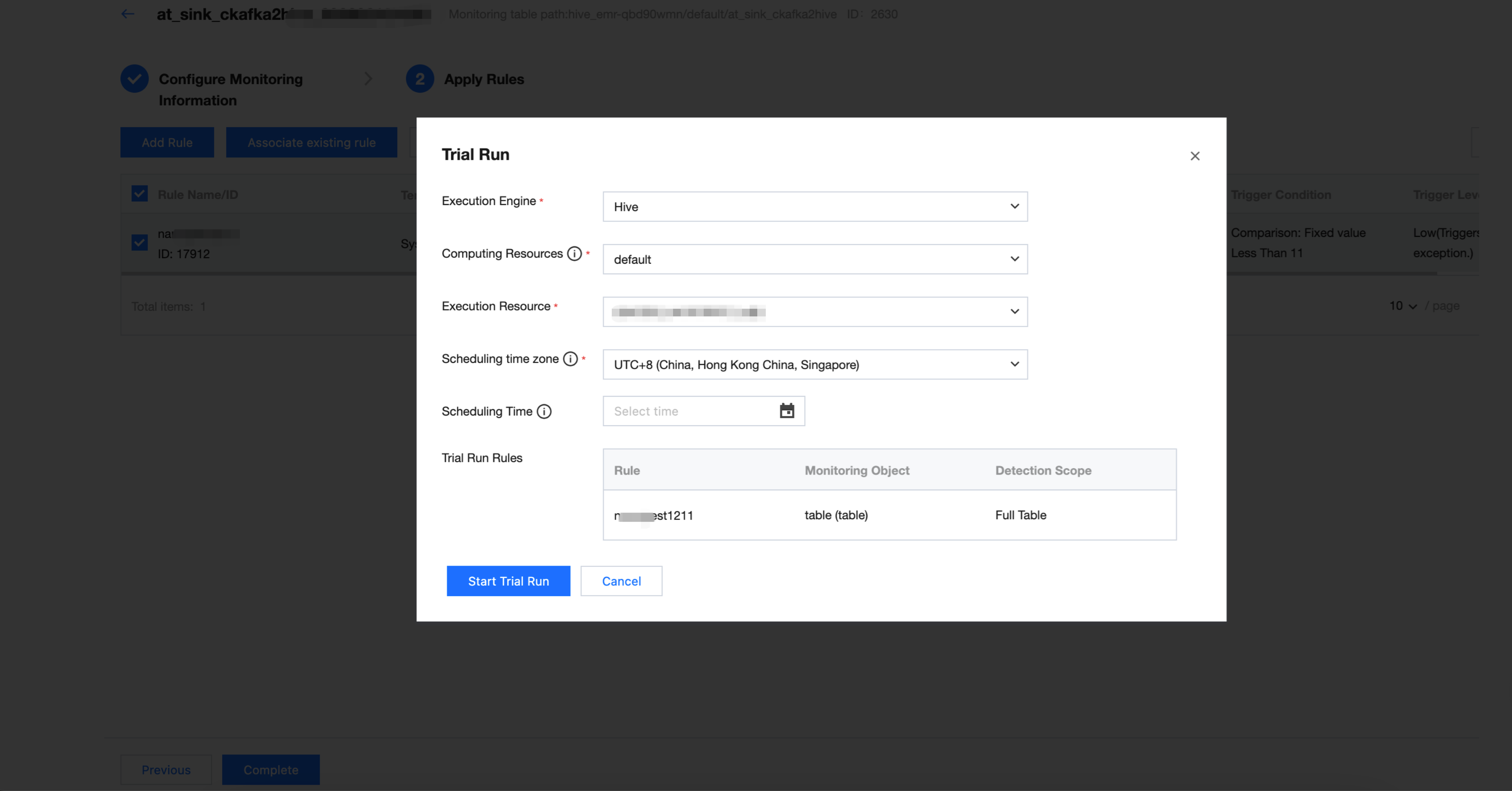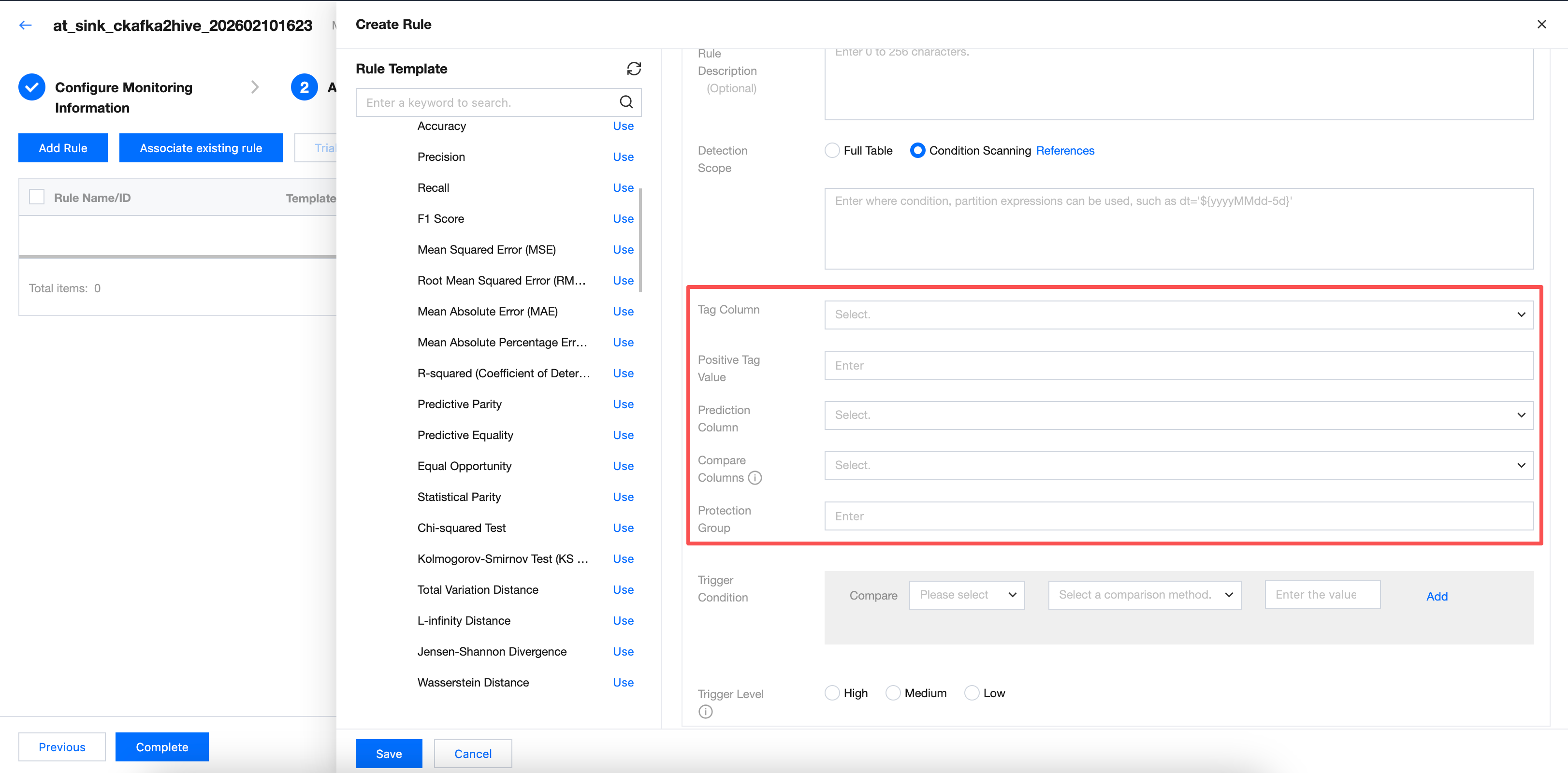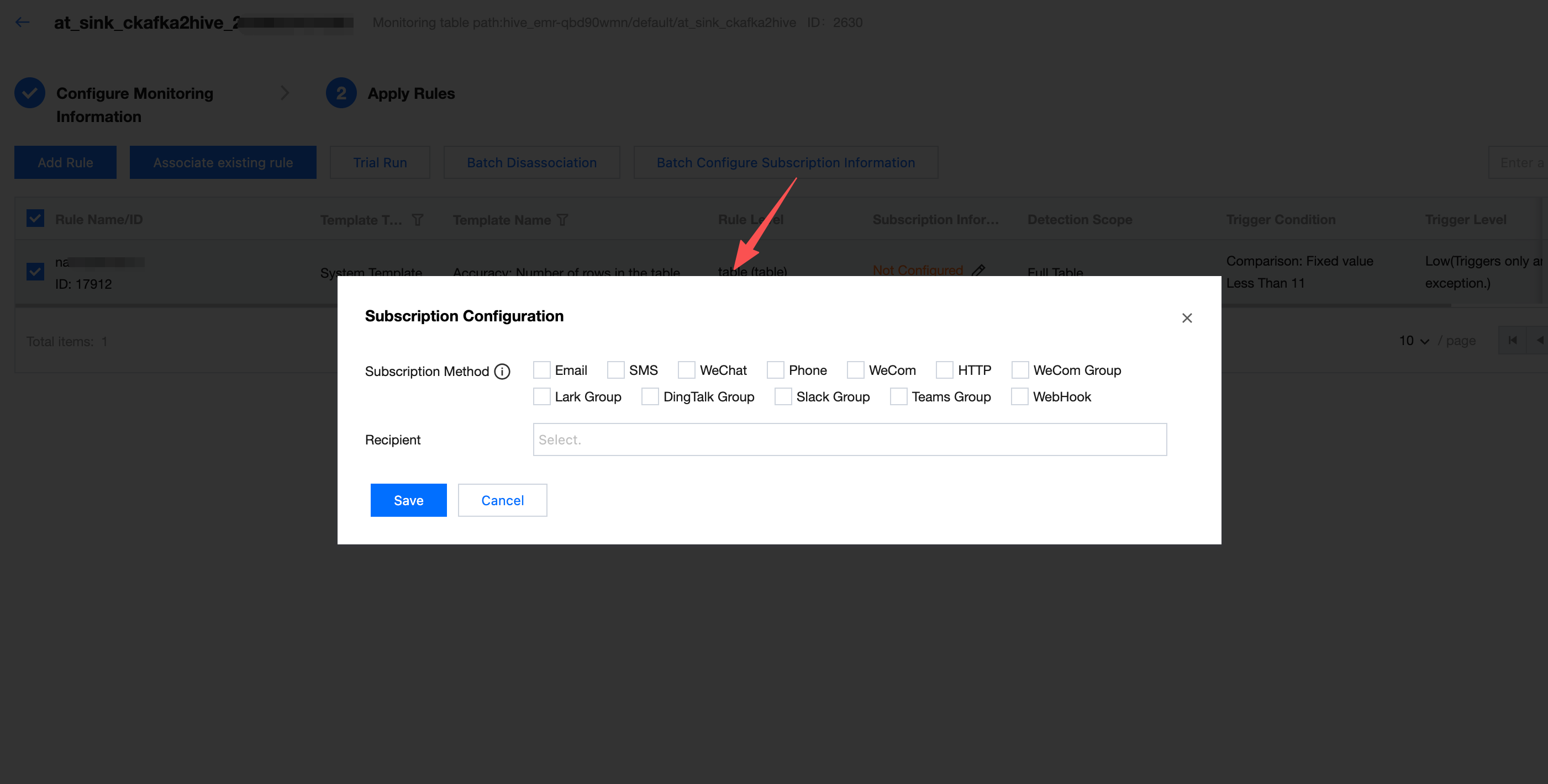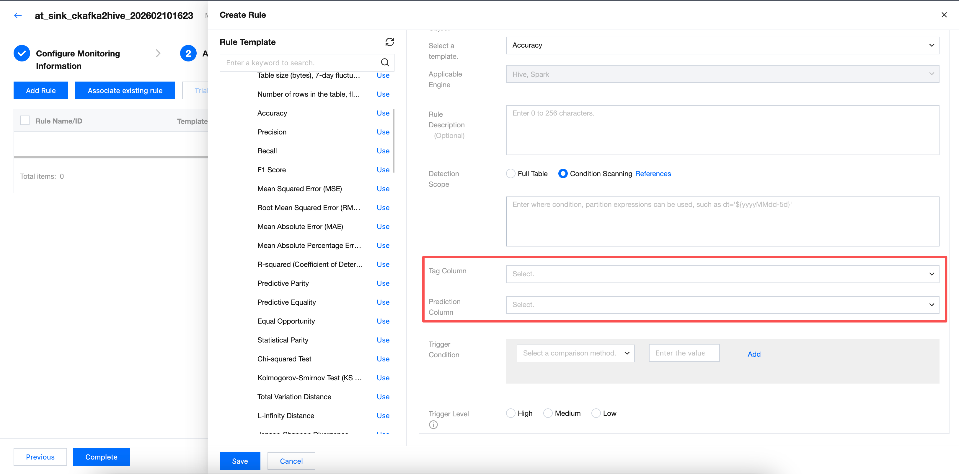 Monitoring Object | Monitoring Object can be divided into table-level and field-level (if you select a rule template from the Left Tree, the selected template parameter will be displayed here by default). Table level: Monitor the number of rows and table size (only supported for Hive tables). Field level: Monitor whether the field is empty, whether to repeat, mean, maximum value, and minimum value. |