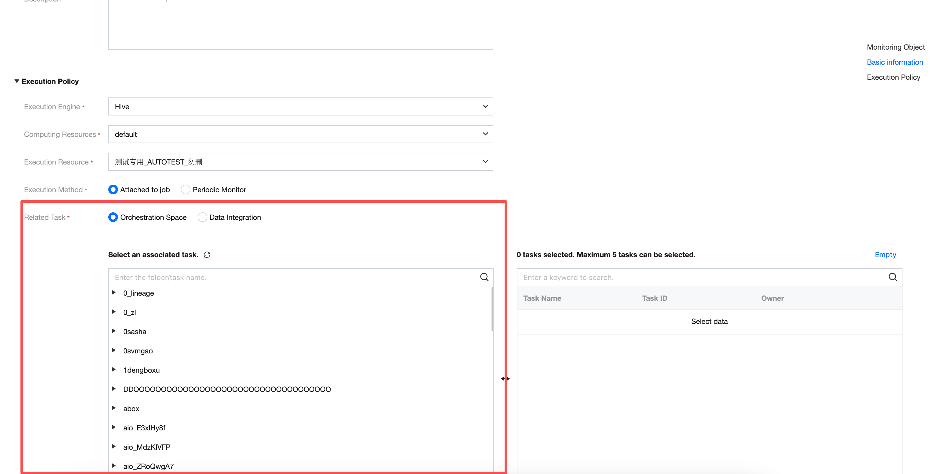 Associated Task | Here you can select the module to which the production task must be associated, development space or Data Integration, and can only be associated with up to 5 tasks: Development space: Shows the directory tree structure in the development space and supports searching folders or task names. Data Integration: Shows the task list in data integration. |