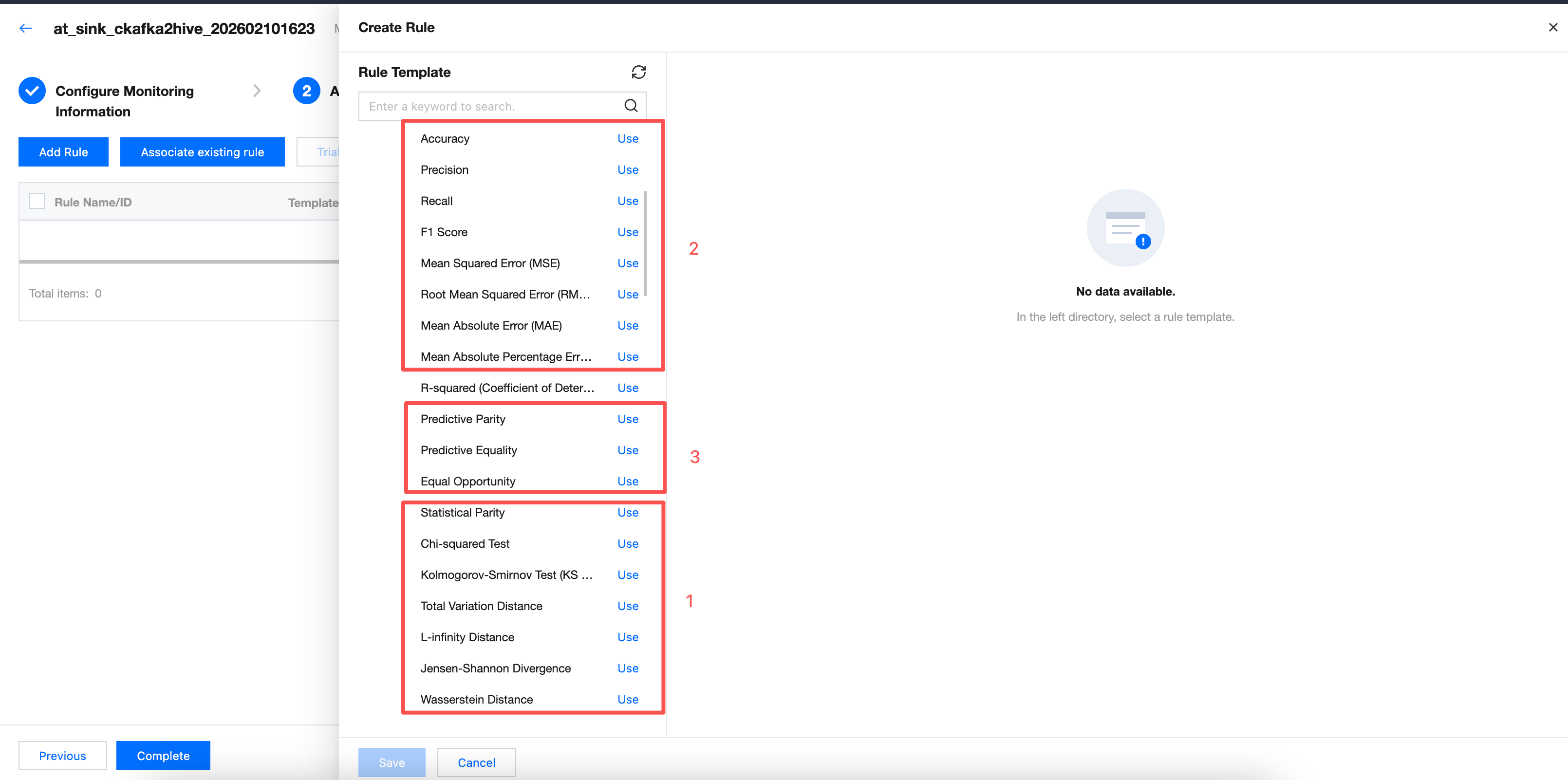 Select Template | WeData has built-in 56 rule templates that can be used for free. For more details on each template, see System Template Description. (if you select a rule template from the Left Tree, the selected template parameter will be displayed here by default). |