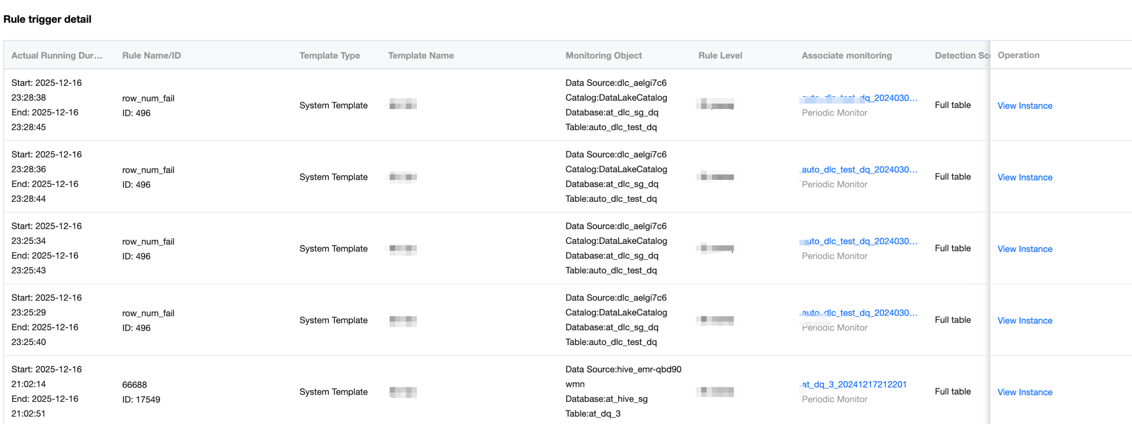 Supports viewing the rule-triggered detailed table in the quality report (including only instances where the rule "Detection results abnormal" is triggered), which summarizes when/which data table/corresponding quality monitoring and rule were triggered ("triggered" means it actually meets the configured rule conditions):