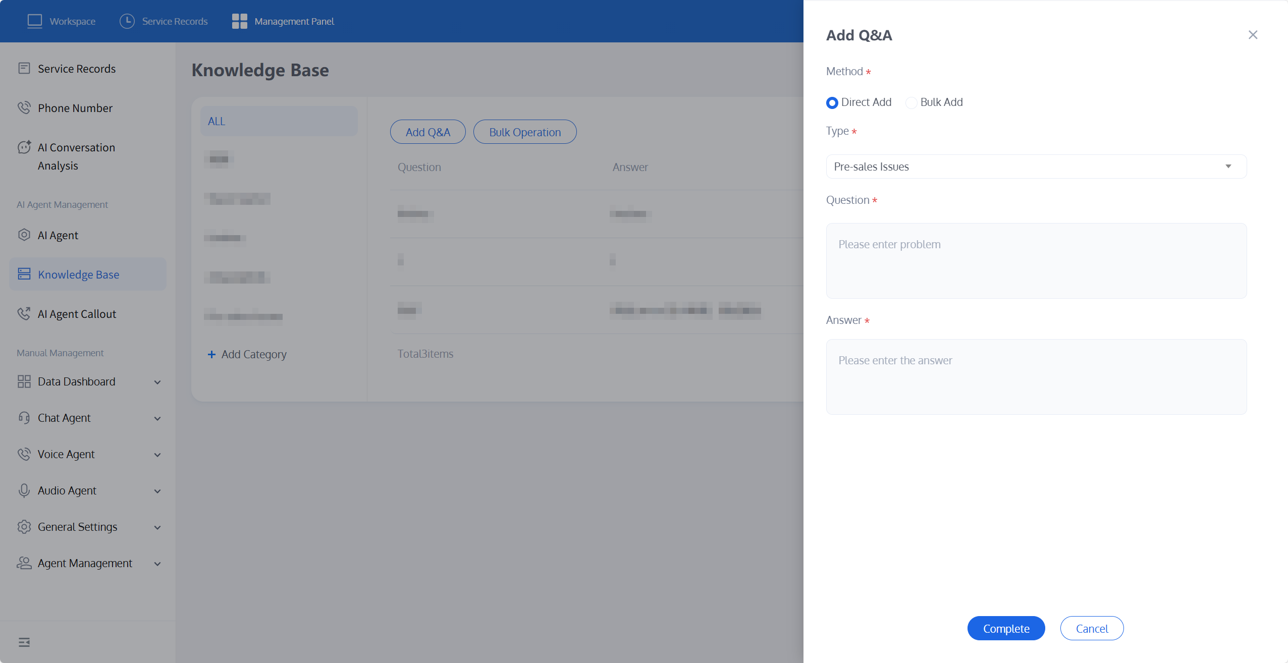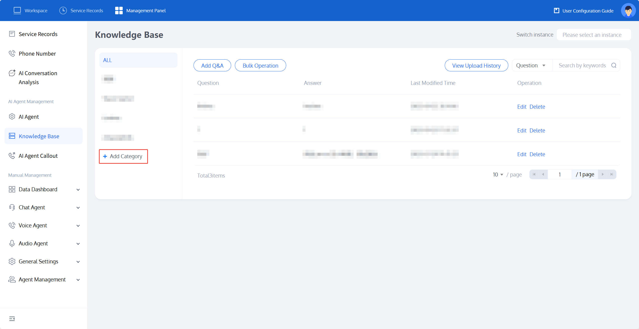 2. After adding a category, click Add Q&A to go to the Q&A settings page. You can add Q&A either by Direct Add or Bulk Add using files.