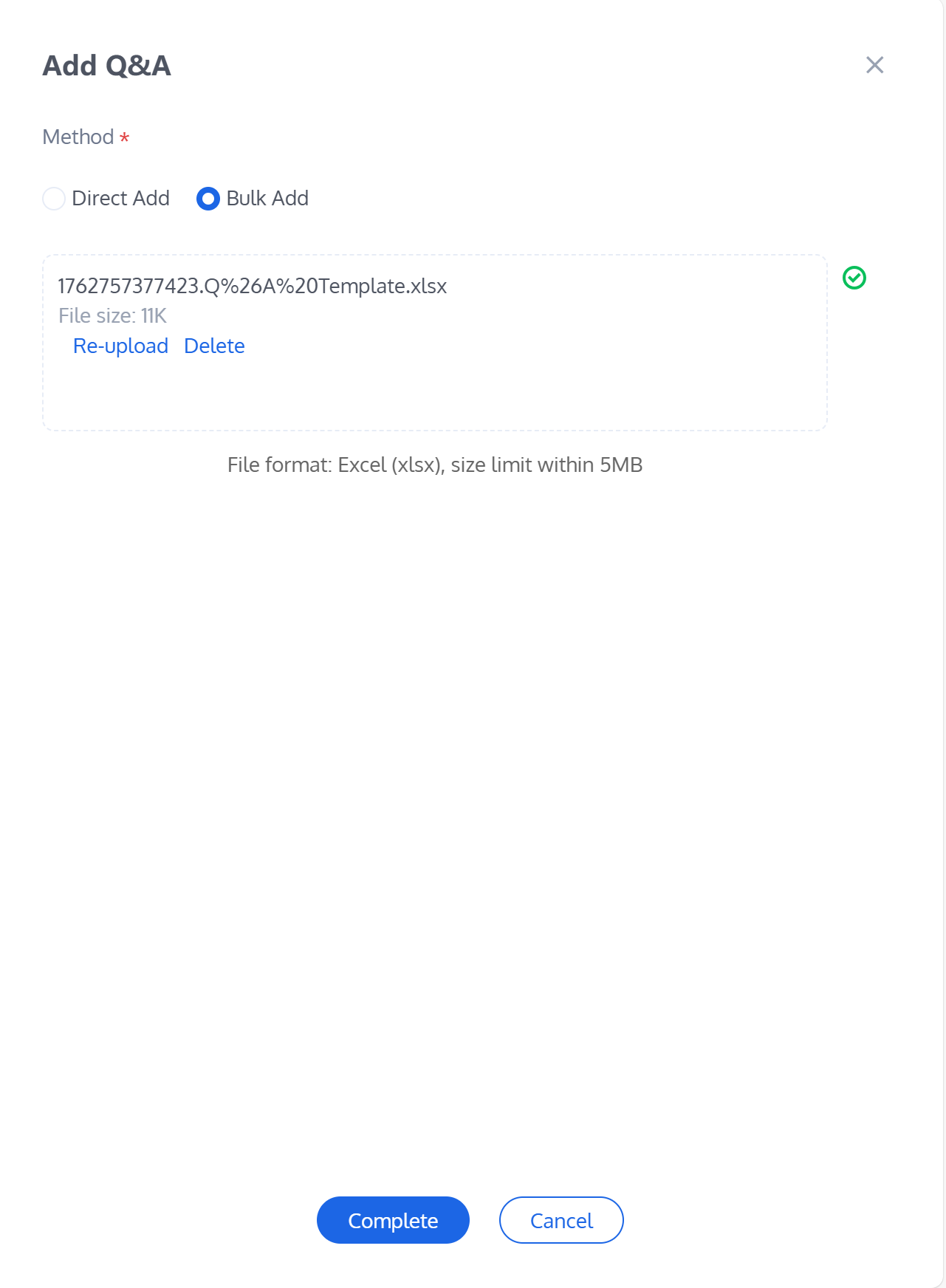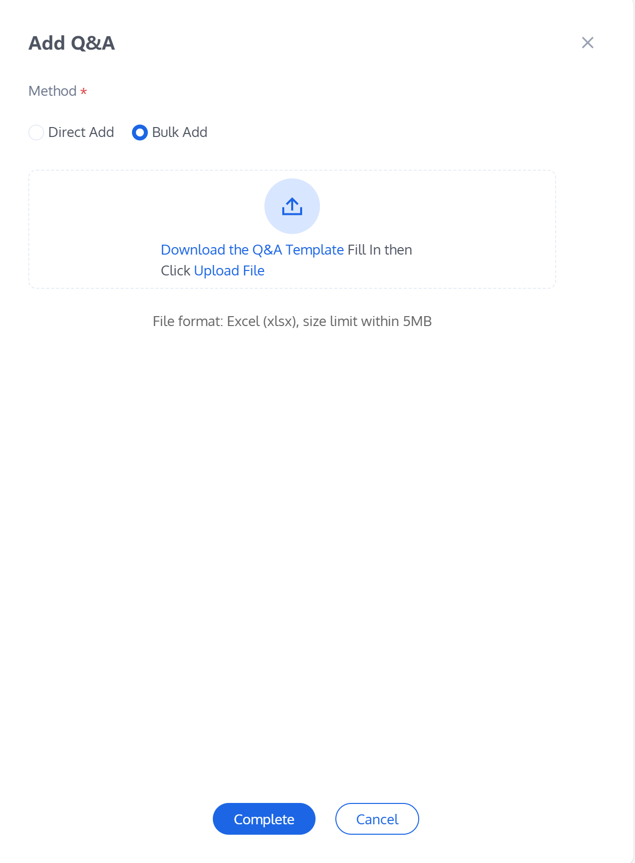 Step 4: After saving the file, go to the Add Q&A page, click Upload File, and upload your saved Q&A template.