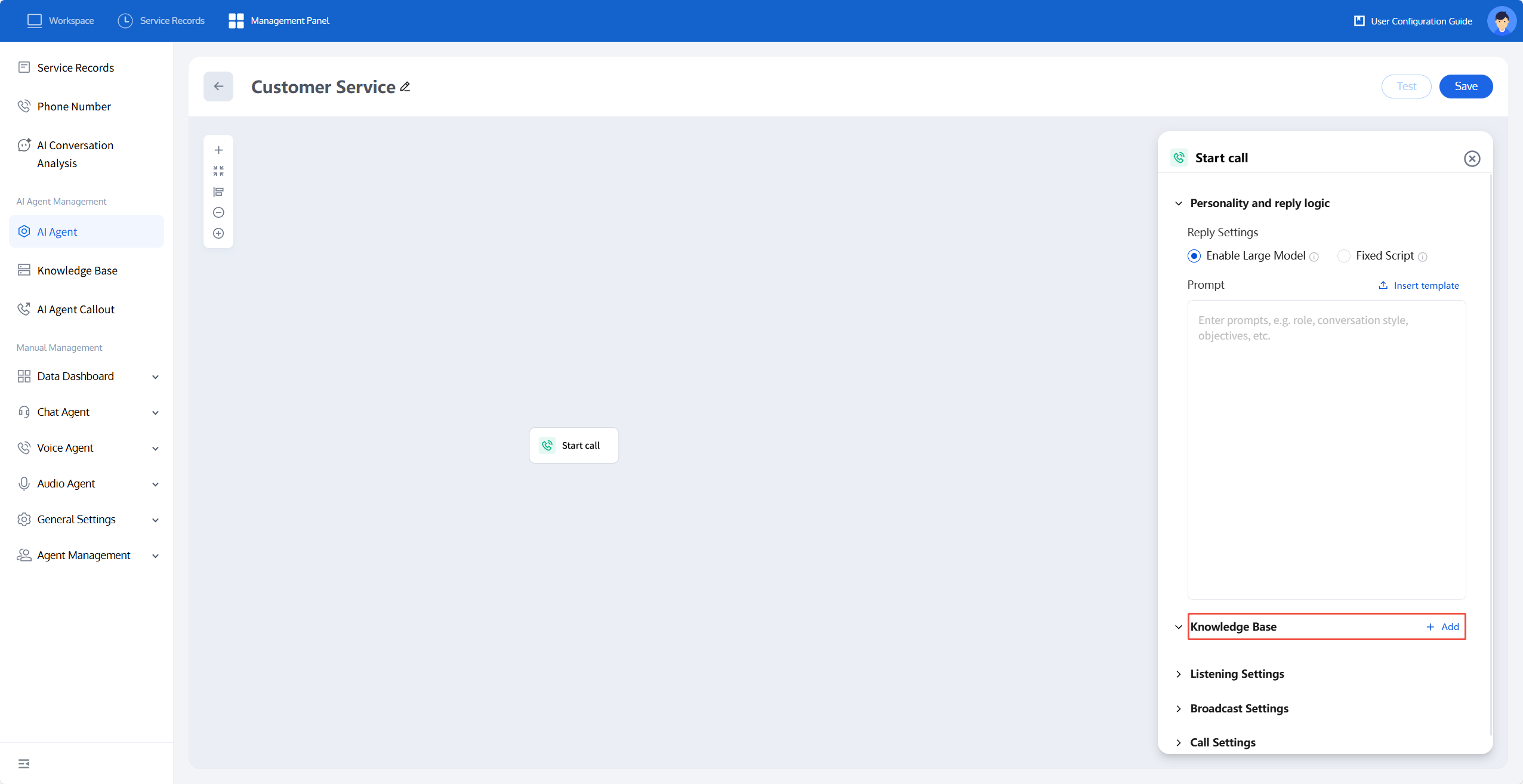 1. After adding the Q&A, select AI Agent from the left sidebar, choose the AI Agent you need to bind to the Knowledge Base (e.g., "Customer Service"), click Start Call, and you will see the Start Call settings appear on the right.