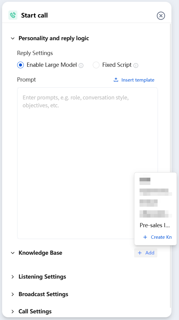 2. In the Start Call settings, click the + Add button next to the Knowledge Base and select the relevant knowledge base. When a user’s question during the call matches a preset question in the knowledge base, the system will automatically provide the corresponding answer to reply. After the answer is given, the system will continue executing the original conversation flow.
