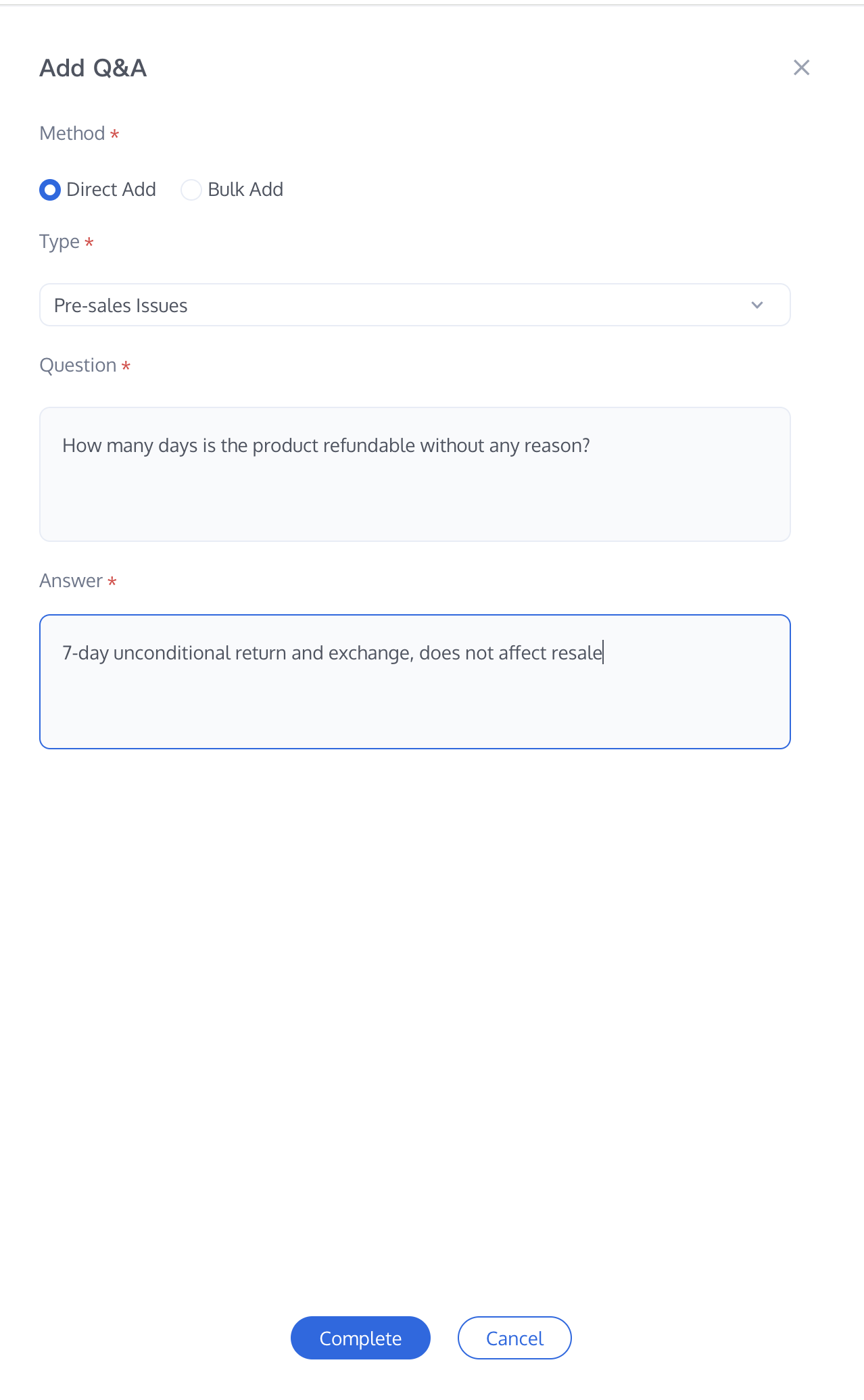 If you select Direct Add, fill in the specific Question and its corresponding Answer (e.g., Question "How many days is the product refundable without any reason?", Answer "7-day unconditional return and exchange, does not affect resale"). Once finished, click the Complete button below to save your changes.