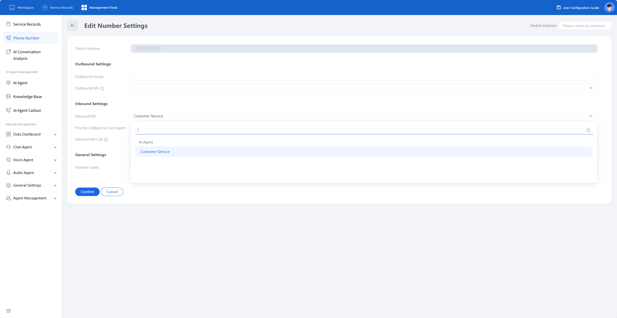2. In Inbound Settings > Inbound IVR, choose your AI Agent (e.g., "Customer Service"). Click Confirm to finish binding. After 1 minute, dial the number to test the inbound call feature.