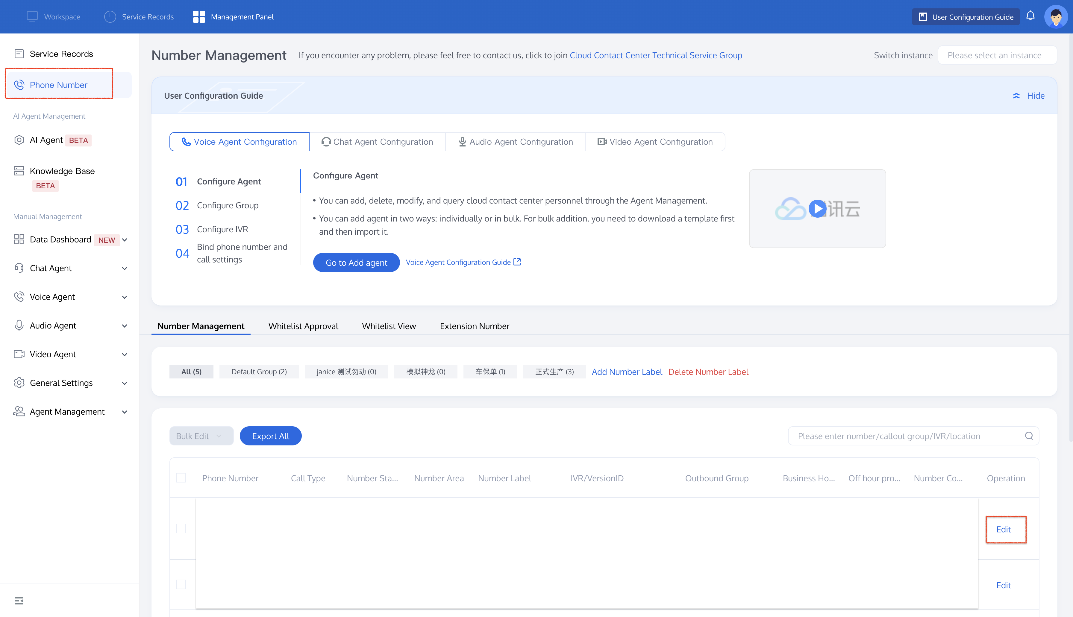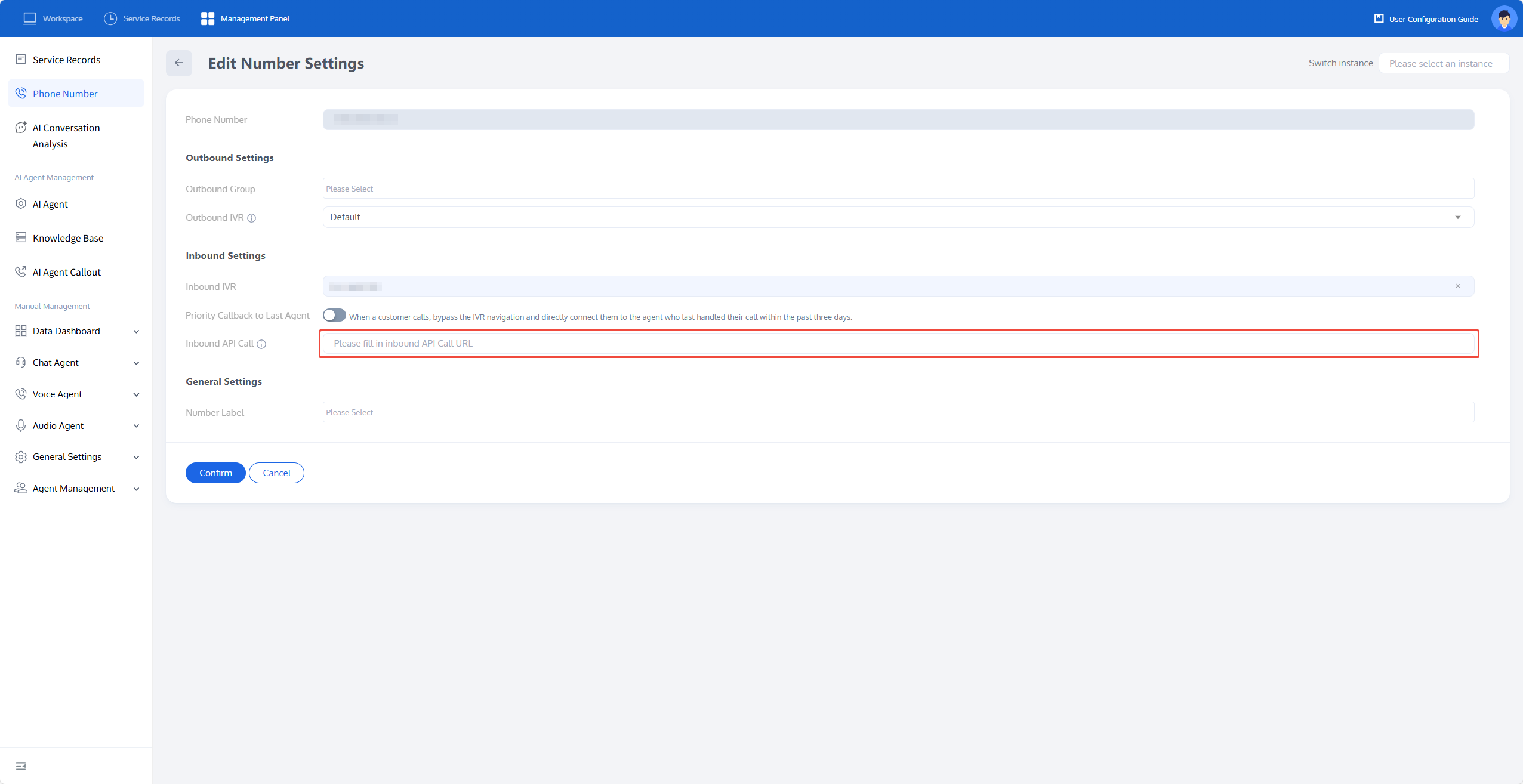 Go to the Edit Number Settings page, fill in the callback URL under Inbound Settings > Inbound API Calls, and click Confirm to save the changes.