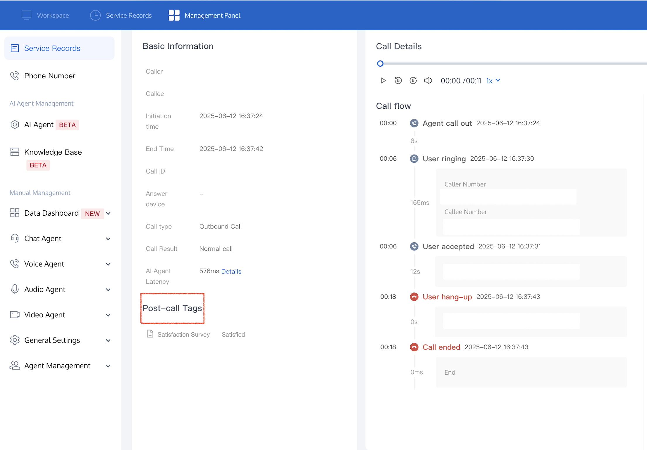 Users can retrieve post-call tags via the API for data analysis and follow-up. For more information, refer to Create AI Agent Call.