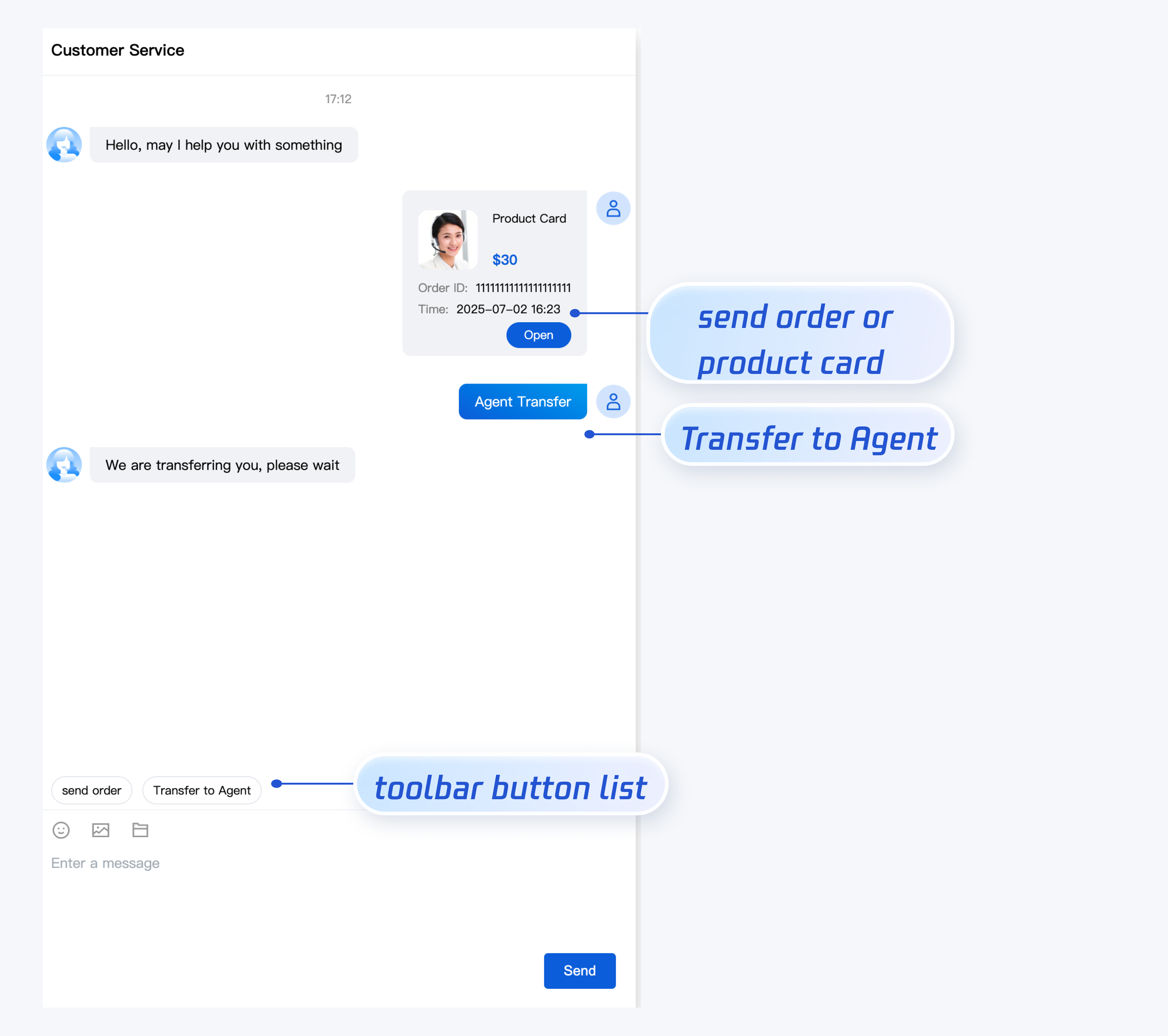 TUICustomerServer.initWithProfile({SDKAppID,userID,userSig,nickName: 'John 1852010****'avatar: 'https://im.sdk.qcloud.com/download/tuikit-resource/avatar/avatar_3.png'}).then(() => {TUICustomerServer.transferToHuman({specificMemberList: ['agent_account_1', 'agent_account_2'], // replace with your agent accountsdescription: 'your description'});});