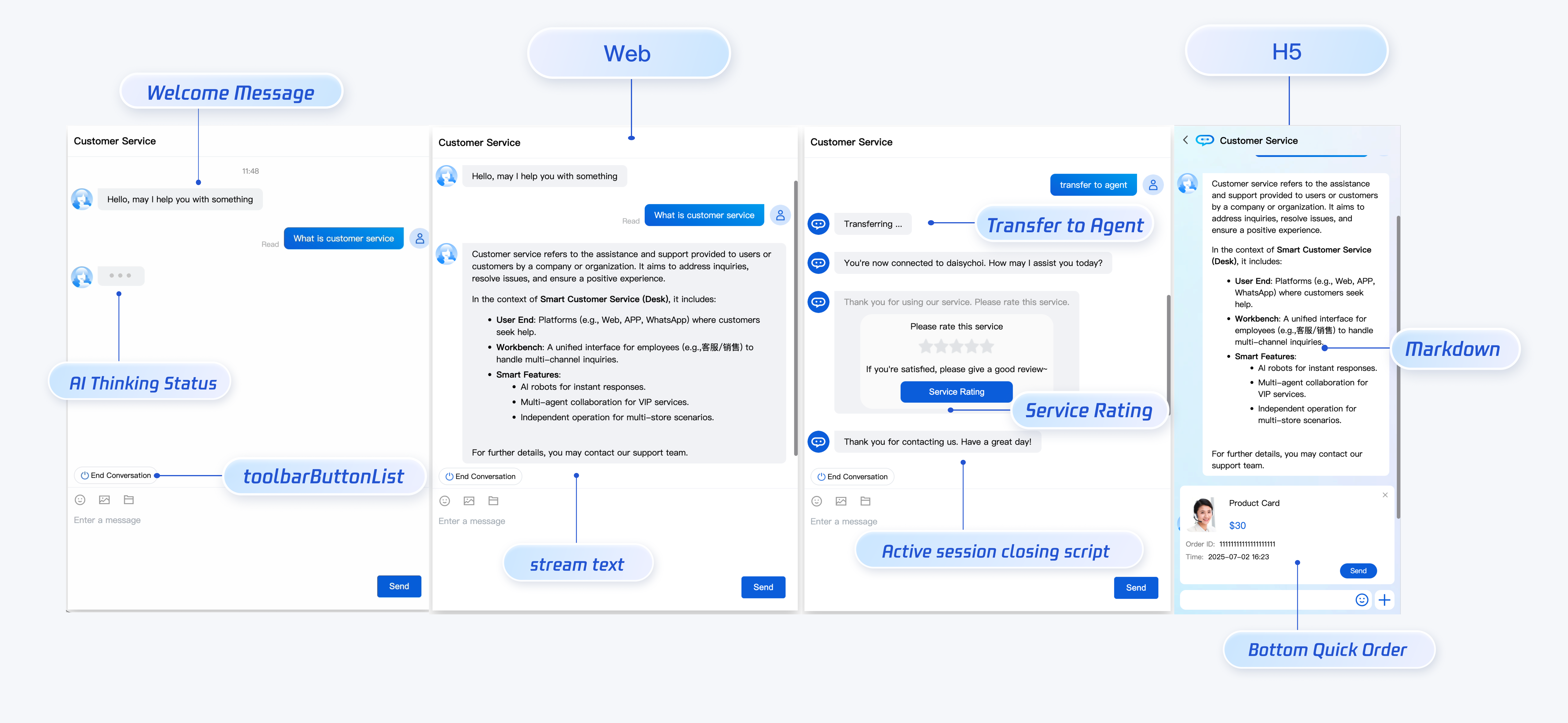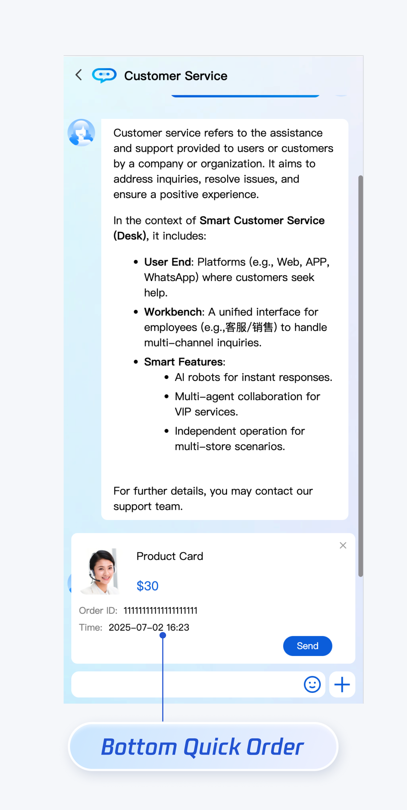 <template><CustomerServiceChat:style="{ width: '600px', height: '80vh', margin: '10px auto', boxShadow: '0 11px 20px #ccc' }":bottomQuickOrder="bottomQuickOrder"/></template><script setup lang="ts">import TUICustomerServer, { CustomerServiceChat } from './ai-desk-customer-vue';import { onMounted } from 'vue';const bottomQuickOrder = {header: "Product Card",desc: "$30",pic: "https://static.cloudcachetci.com/qcloud/portal/kit/images/presale.a4955999.jpeg",url: 'https://your_url.com',customField: [{name: 'Order ID',value: '11111111111111111111'},{name: 'Order Time',value: '2025-07-02 16:23'}]};onMounted(() => {const SDKAppID = 0; // Your SDKAppIDconst userID = ''; // Your userIDconst userSig = ''; // Your userSigTUICustomerServer.init(SDKAppID, userID, userSig);});</script><style scoped></style>