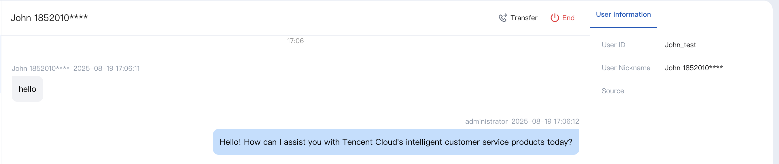 TUICustomerServer.initWithProfile({SDKAppID,userID,userSig,nickName: 'John 1852010****'avatar: 'https://im.sdk.qcloud.com/download/tuikit-resource/avatar/avatar_3.png'}).then(() => {TUICustomerServer.transferToHuman({groupID: 0, // replace with your customer service agent group IDdescription: 'your description'});});