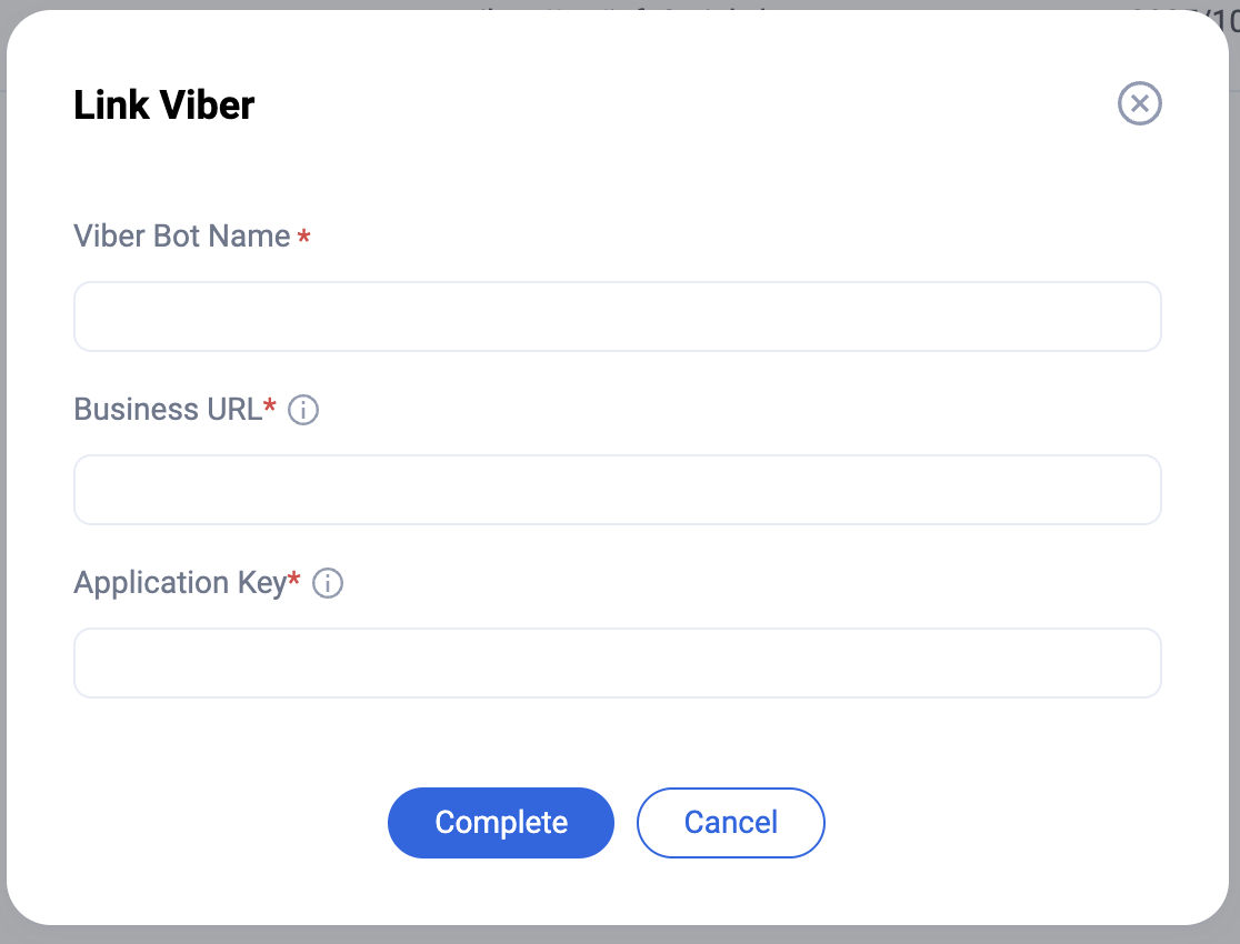 Enterprise account URL and application key. You may go to Viber configuration page, Viber Setting > My Bots, select the Bot you want to integrate, click edit > copy APP Key.
