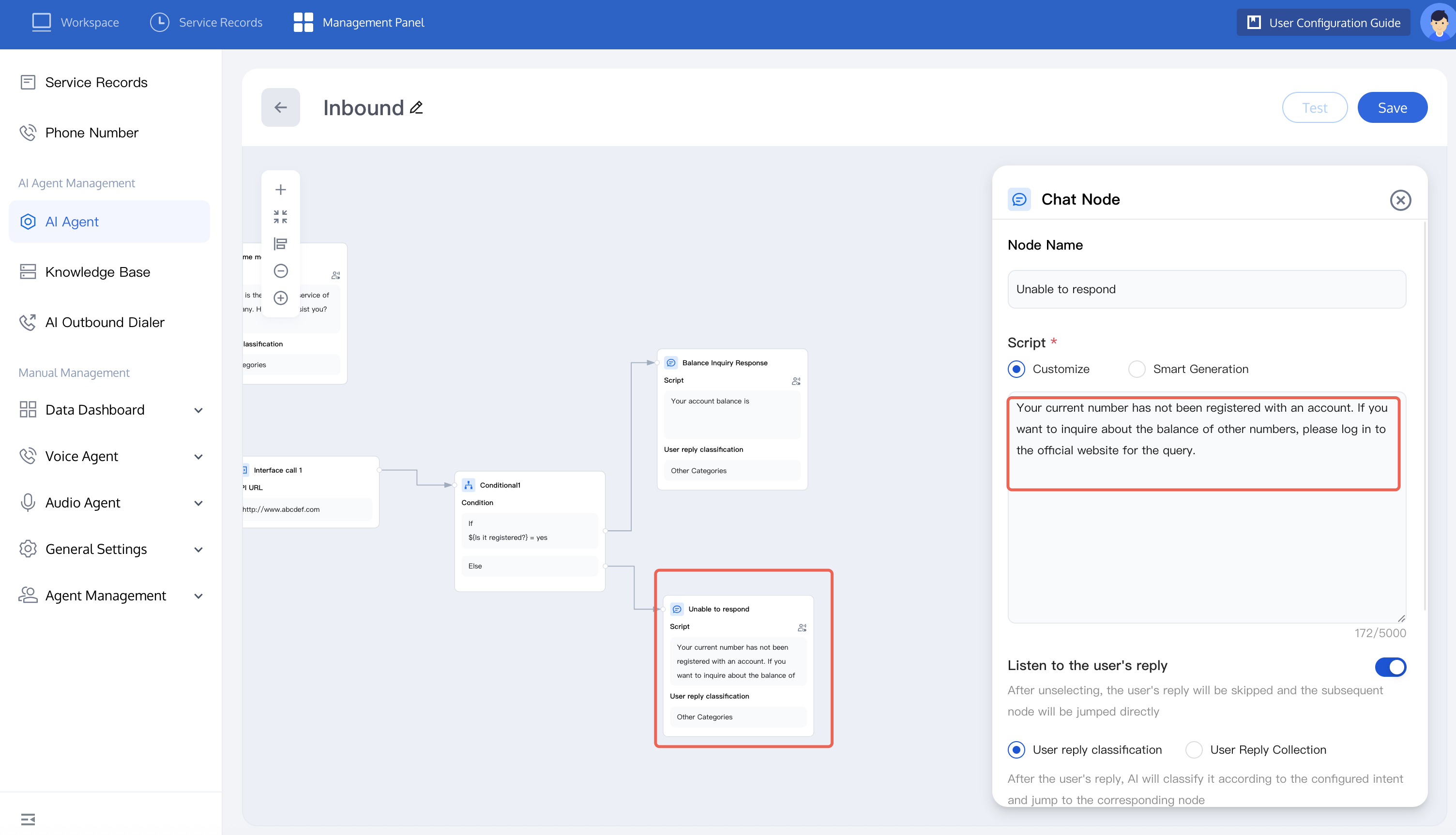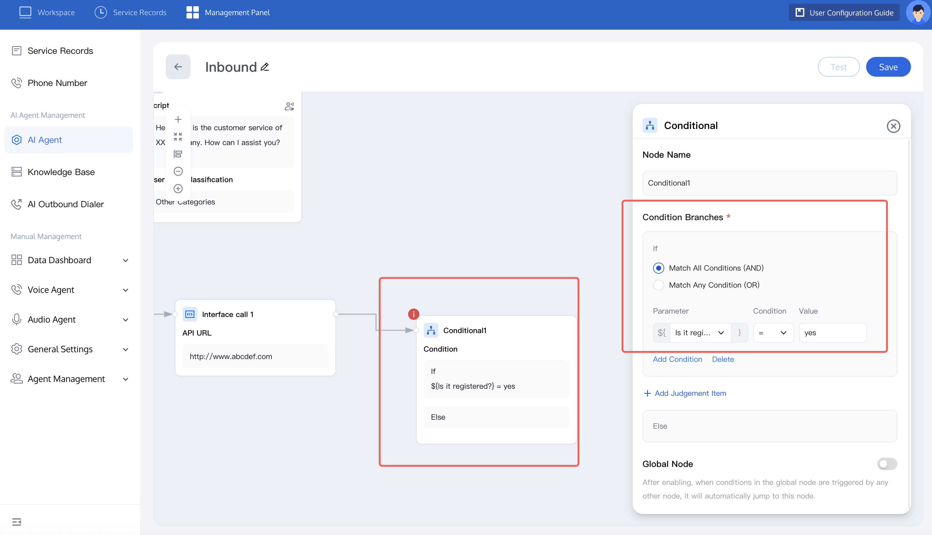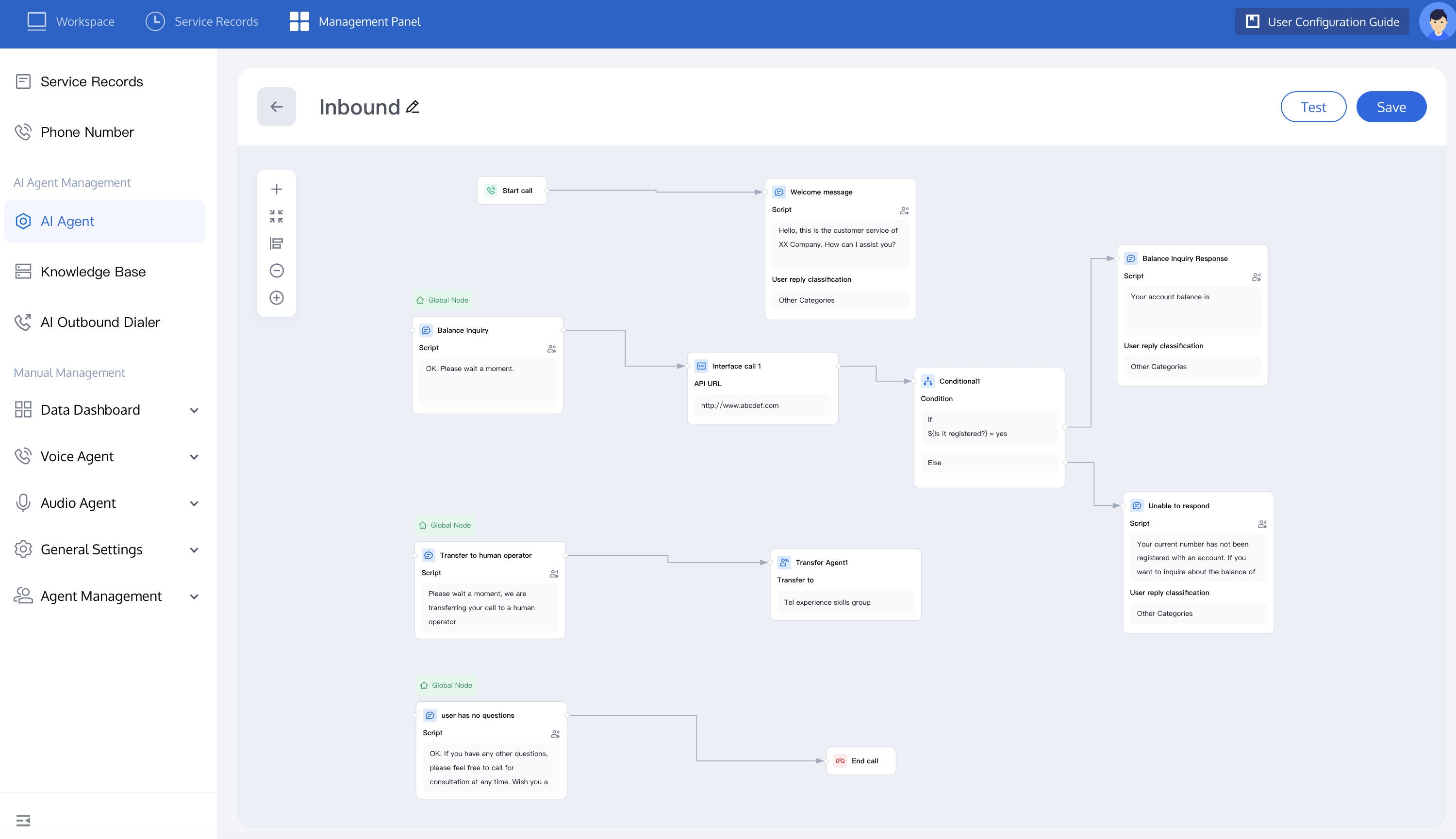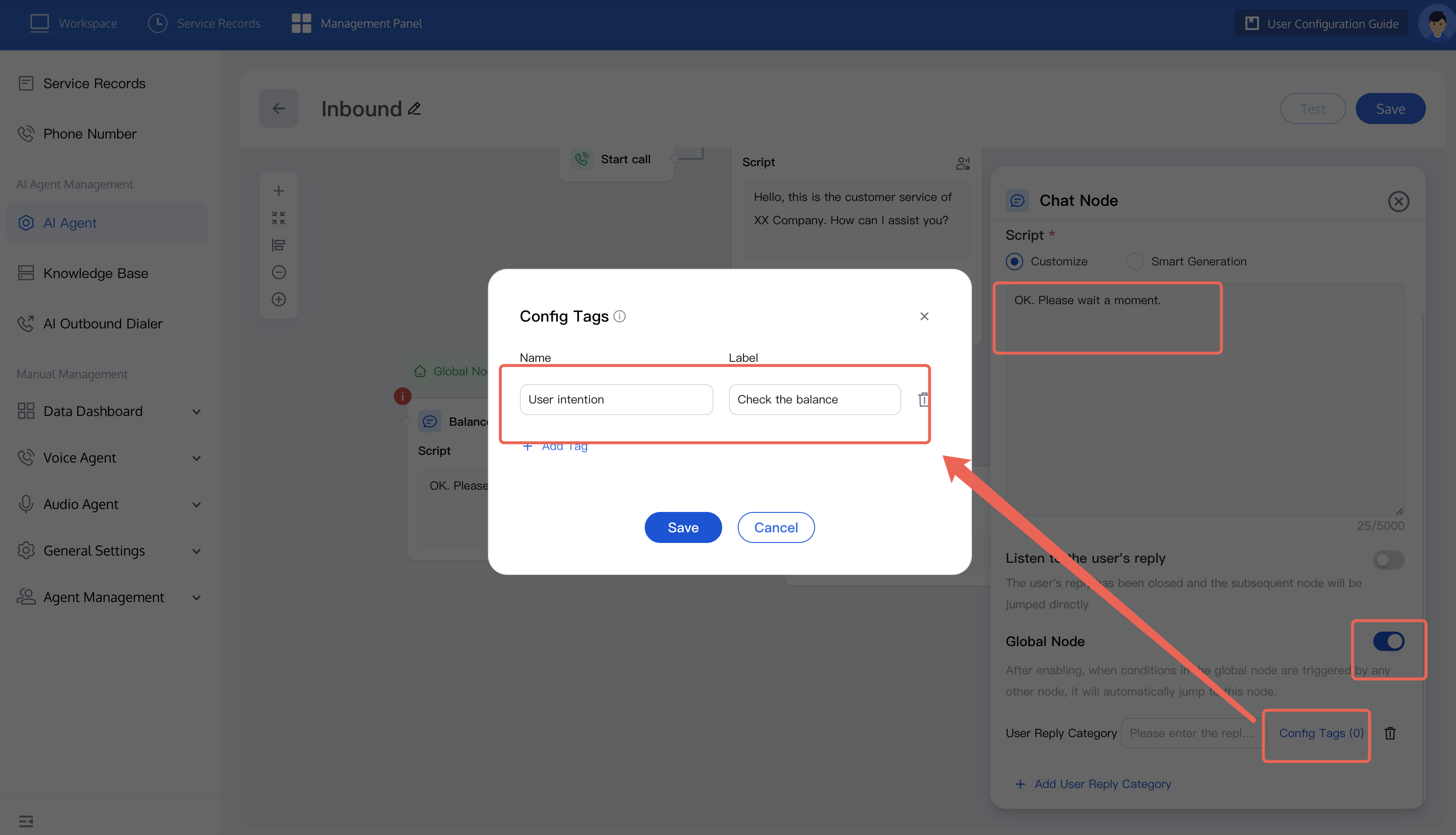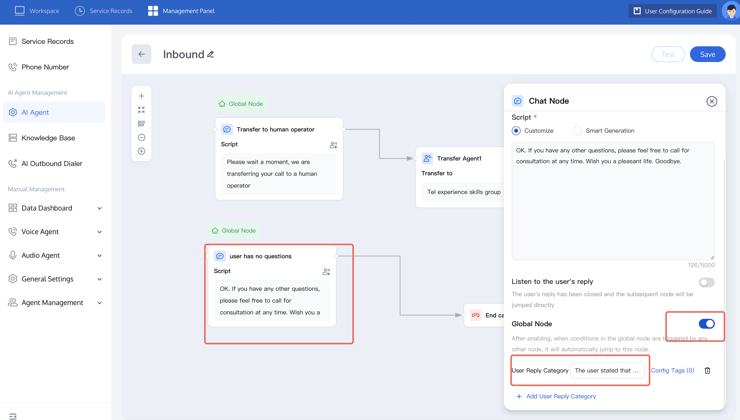 4. In an inbound call scenario, the call process may involve redirection between multiple nodes, so you need to set a global node to end the call. You can refer to the figure below to set the user's intent to end the dialogue in the global node and complete the dialogue. Once enabled, when any other node triggers the conditions in the global node, automatic redirection to this node is allowed.