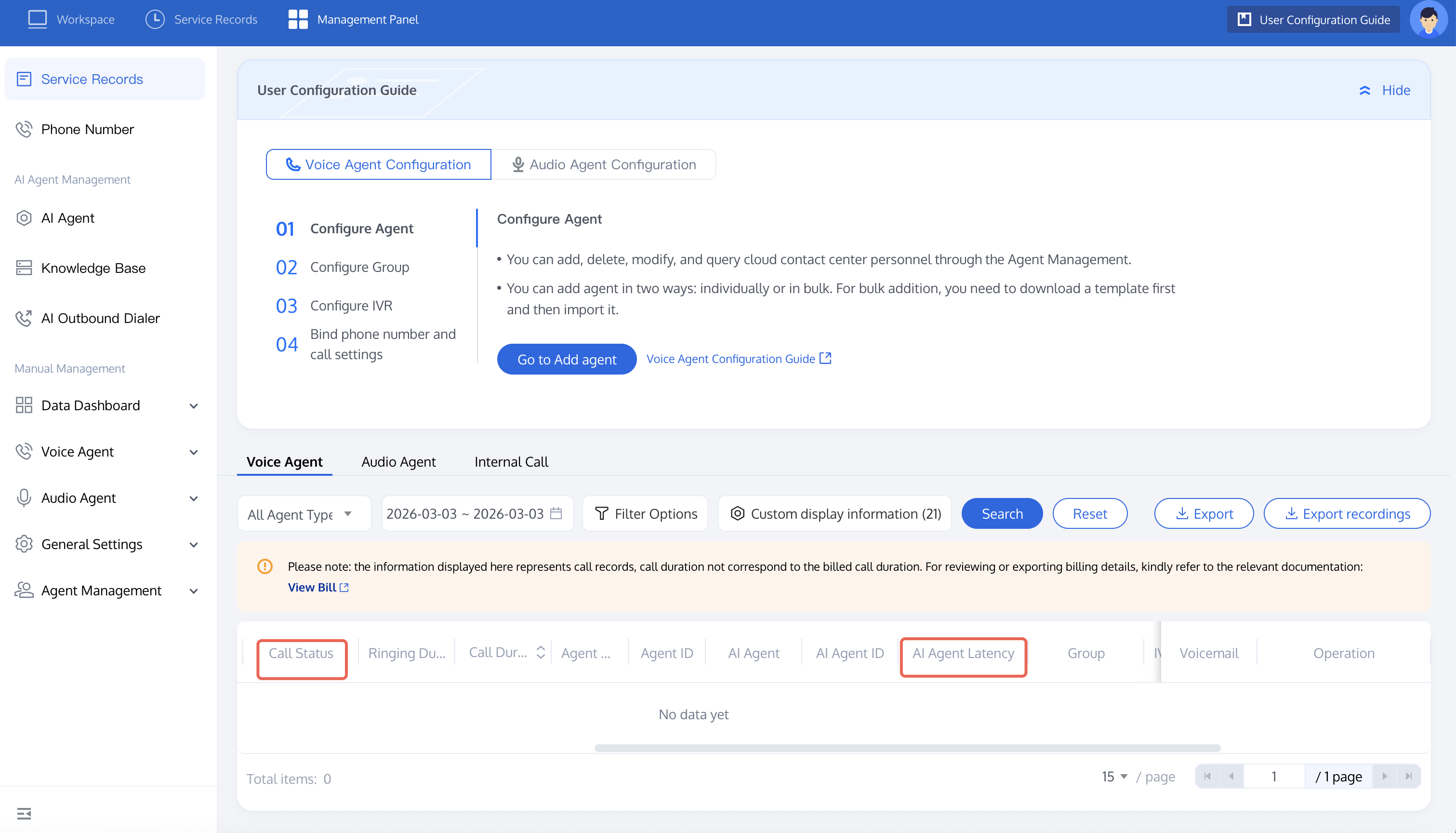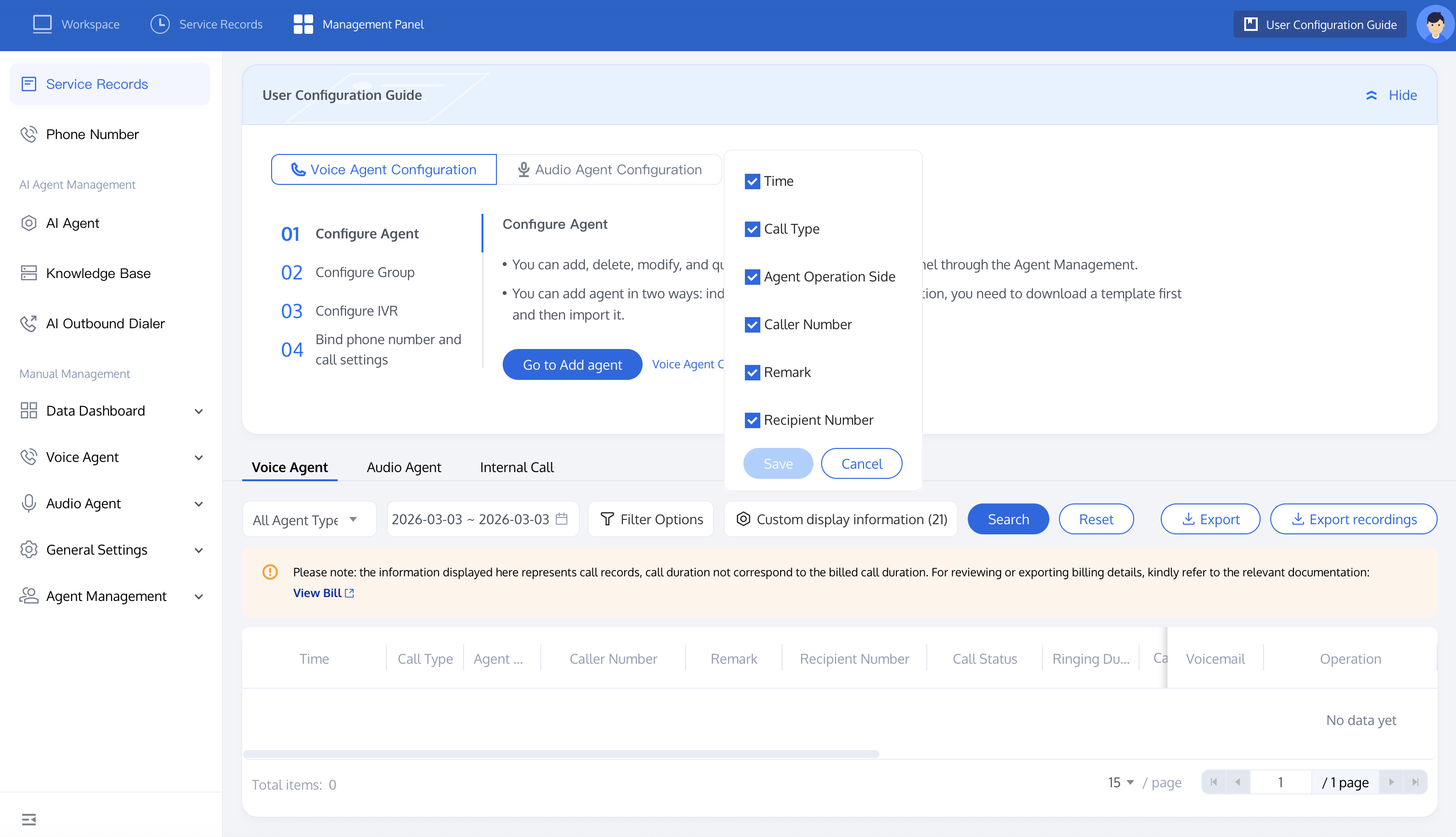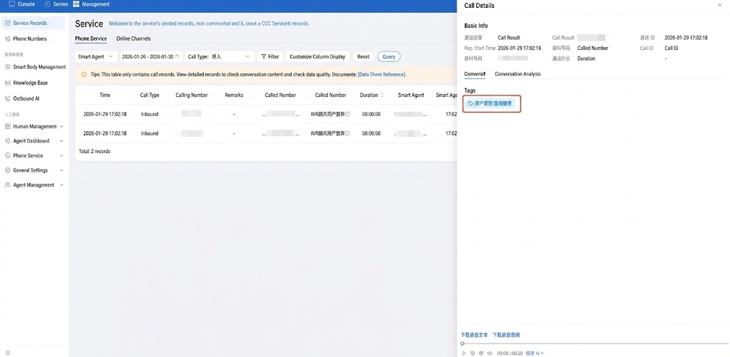 Enter the management console and go to service record. You can search for call records you want to view through whether it is an AI Agent call, time and customized filter options. It is recommended to select call type in filter options and choose dial-in as the type to quickly query inbound calls.