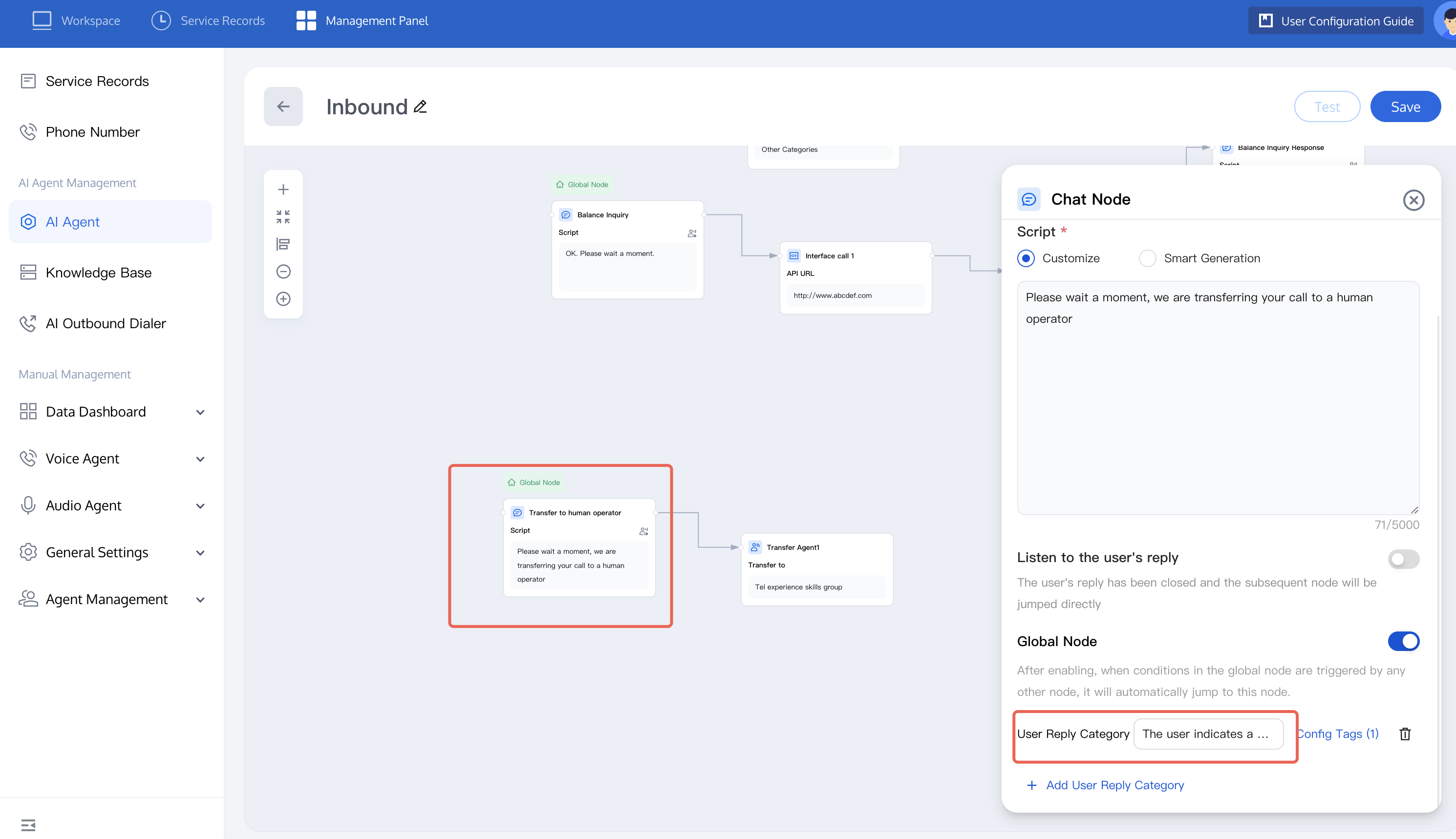 Transfer to agent: If a certain question needs to be answered by a live agent, you can add new dialogue nodes and transfer to human agent, or connect the transfer to agent node with the two types of question nodes mentioned earlier. Set the dialogue node as a global node. After the user expresses the intent to transfer to an agent, it will automatically redirect. Configure the script as shown below.