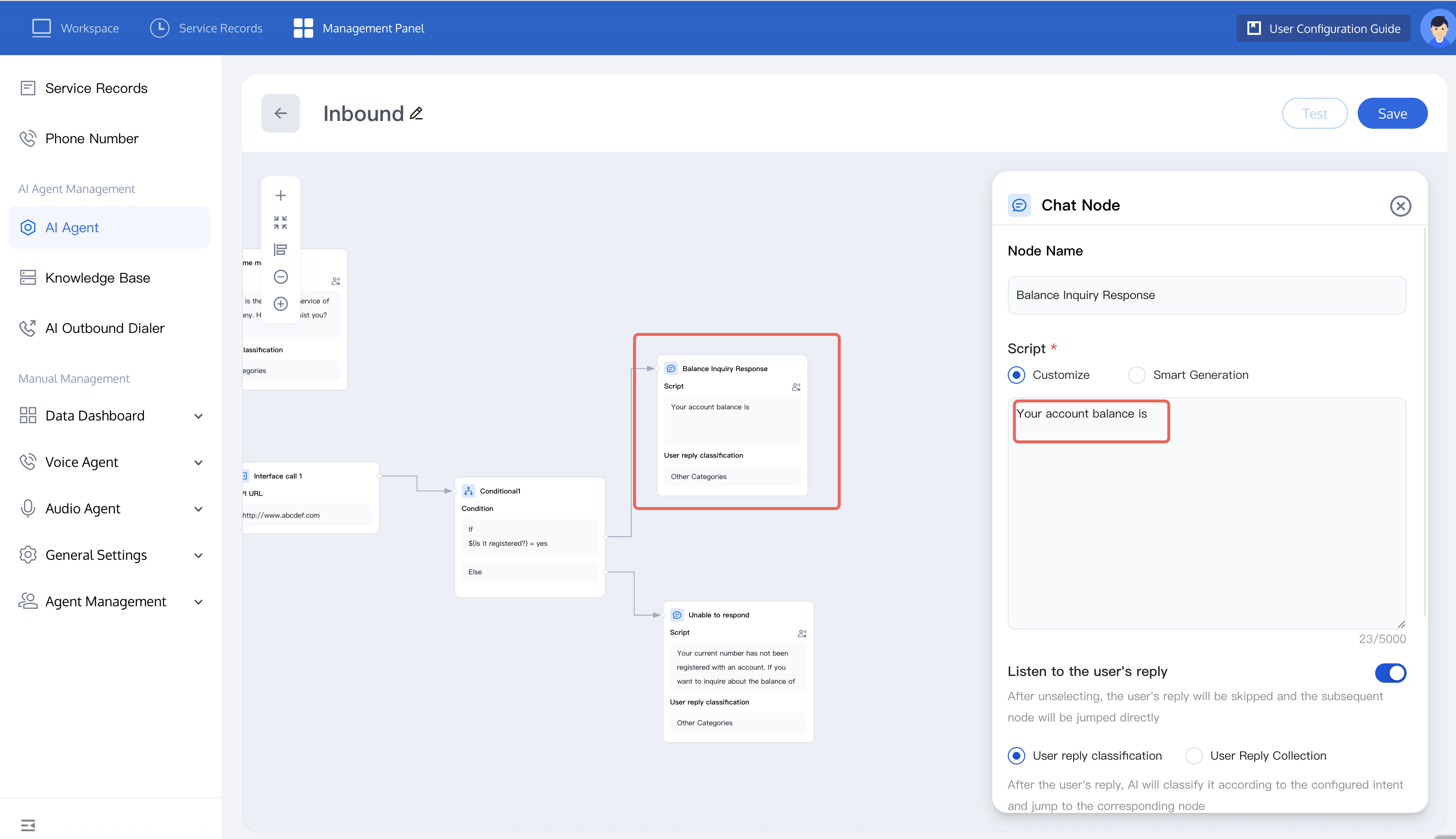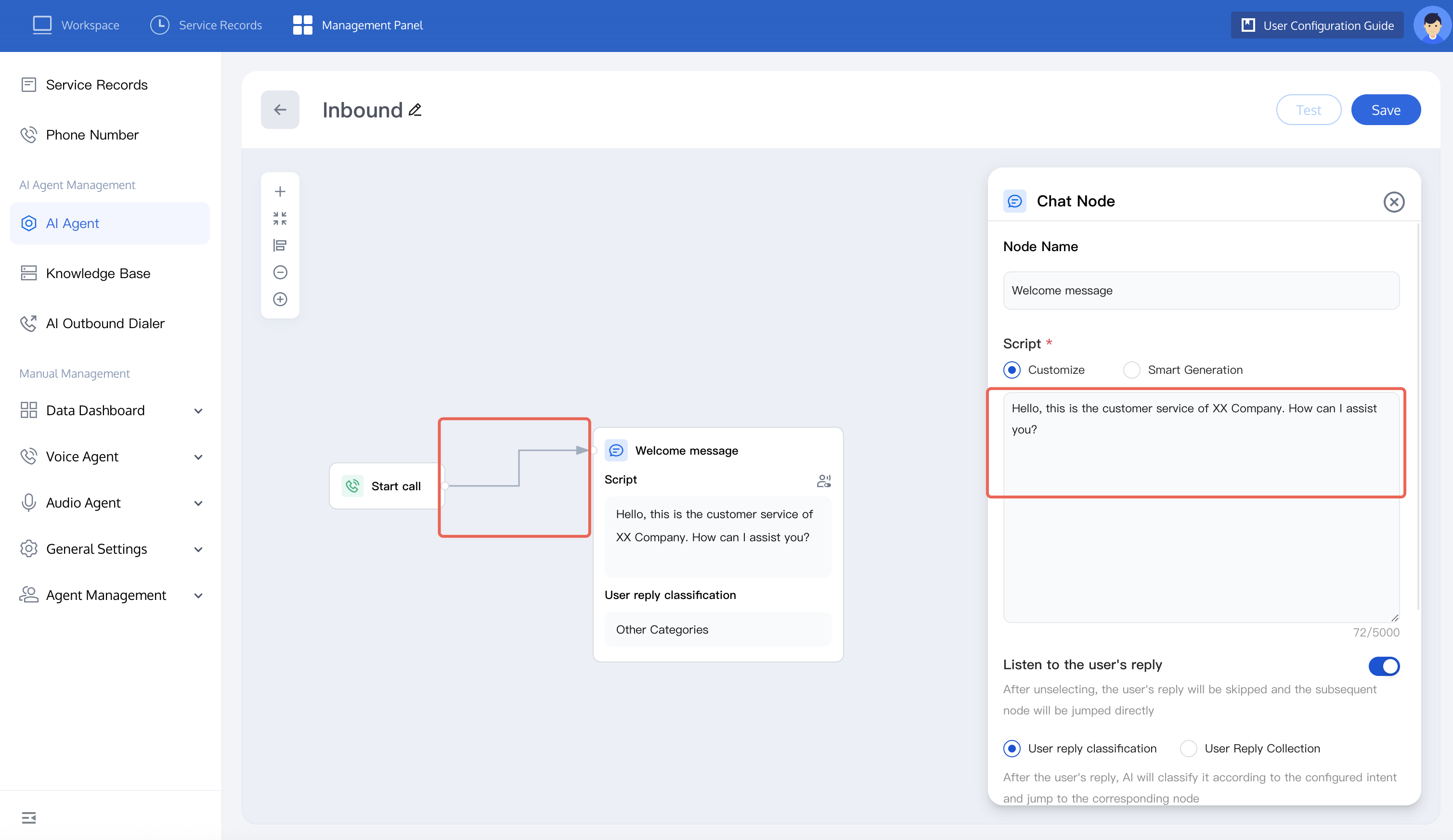 5. If you want to learn more about node functions, see node introduction. After completion, you can test the dialogue effect of the AI Agent. For detailed operations, refer to test dialogue effect.