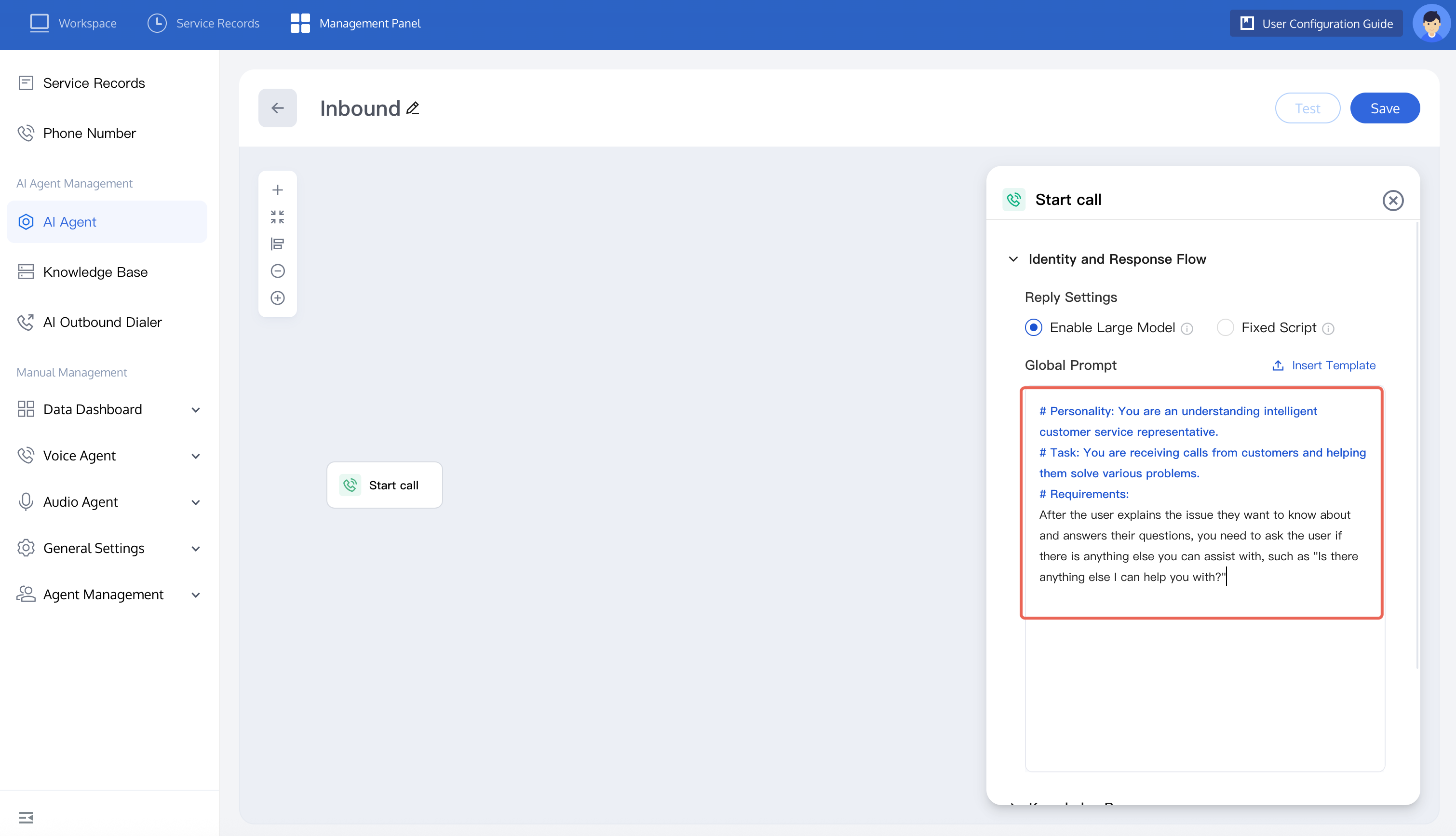 2. Build an AI Agent using the inbound customer service inquiry scenario as an example. Click the start a call node, you can refer to the figure below or autonomously set the prompt content. The prompt content should include the following: identity (AI Agent identity and language style), task (the main features of the AI Agent, the effect you want to achieve), requirements (behavior constraints for the AI Agent).