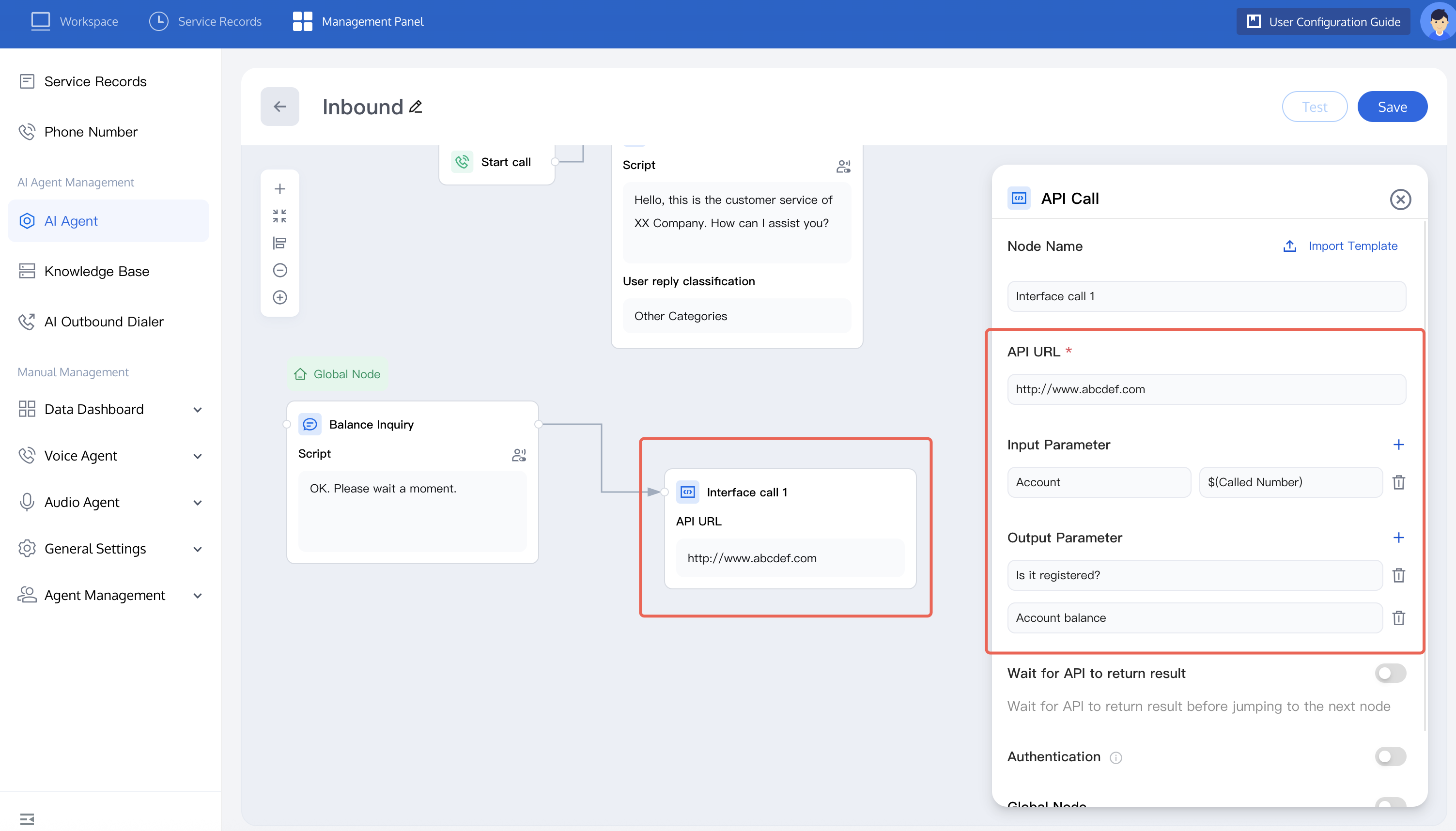 If you wish to trace the user's question, you can refer to the figure below to set tags. In the API call node, you can configure the API address, input parameter, and output parameter according to business needs.