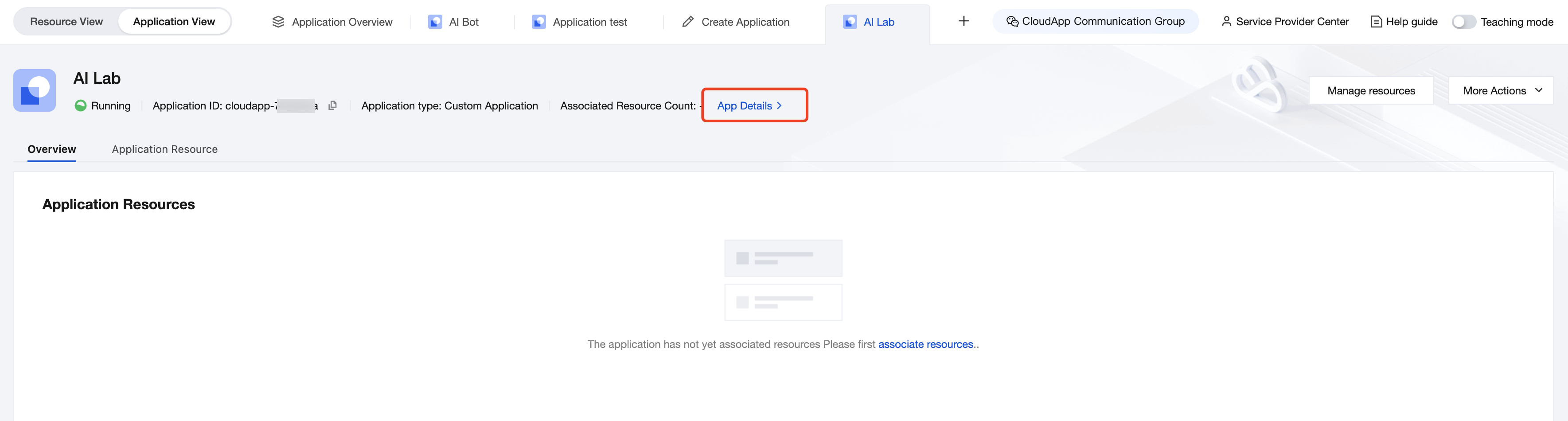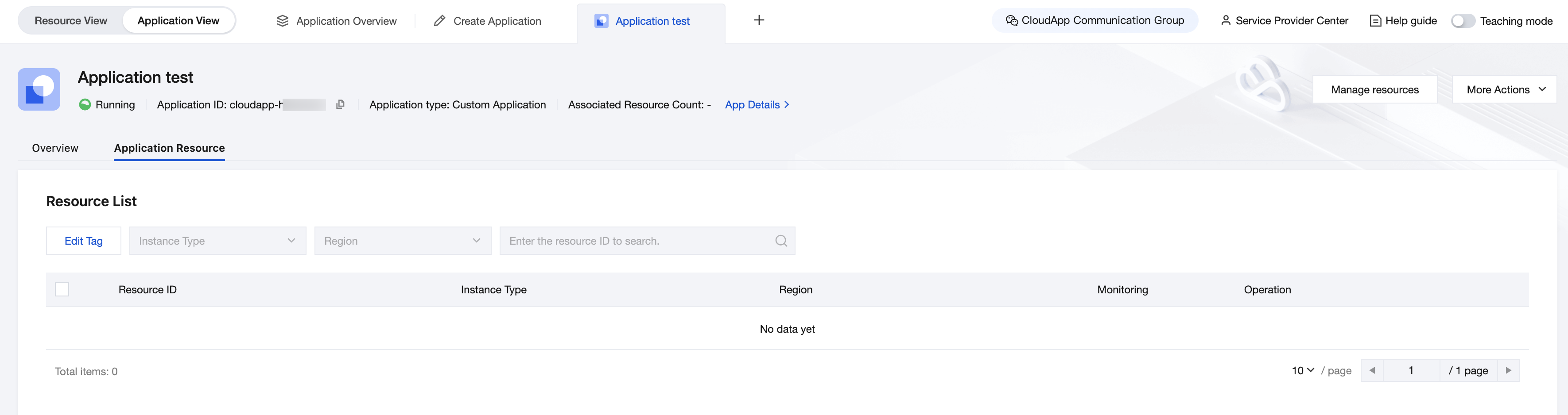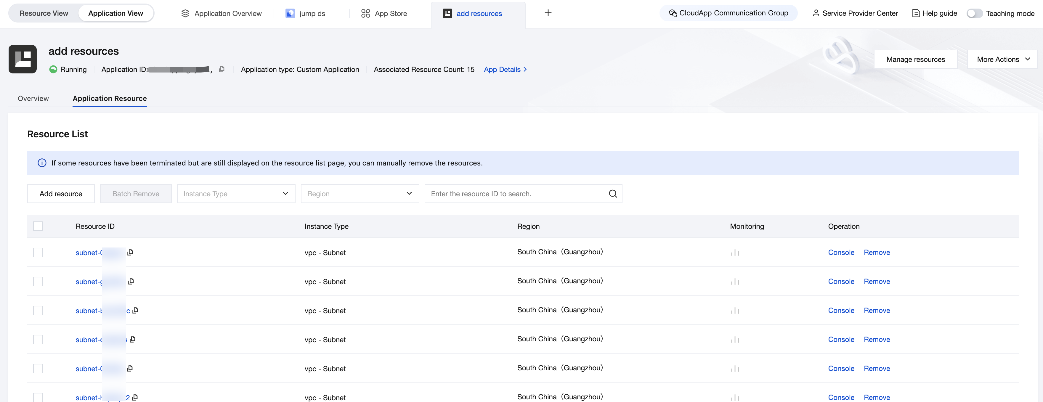 アプリ詳細ページの右上隅にあるリソース管理をクリックすると、リソースリストに切り替わります。