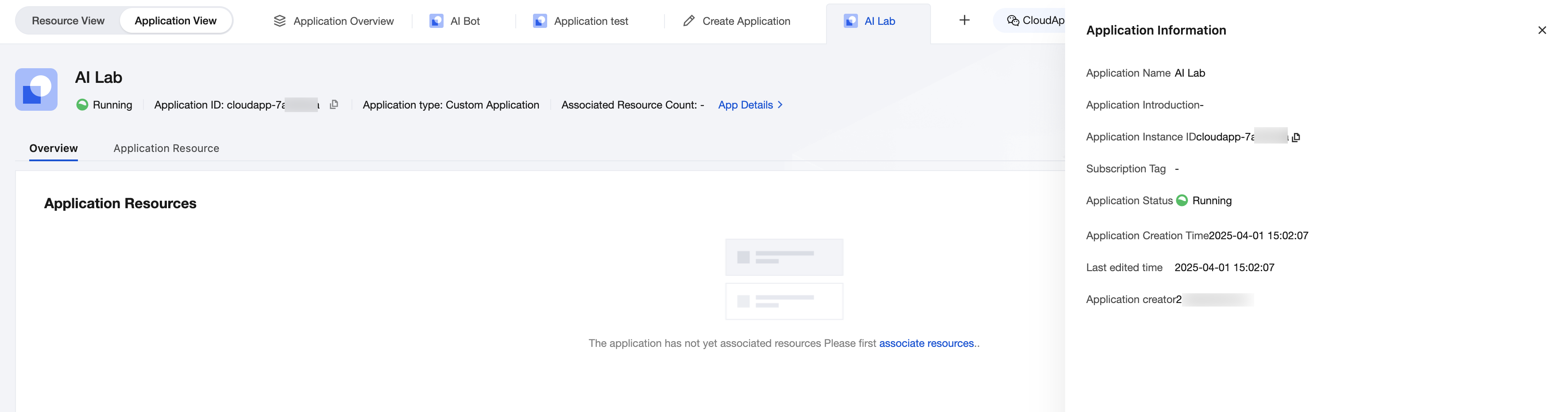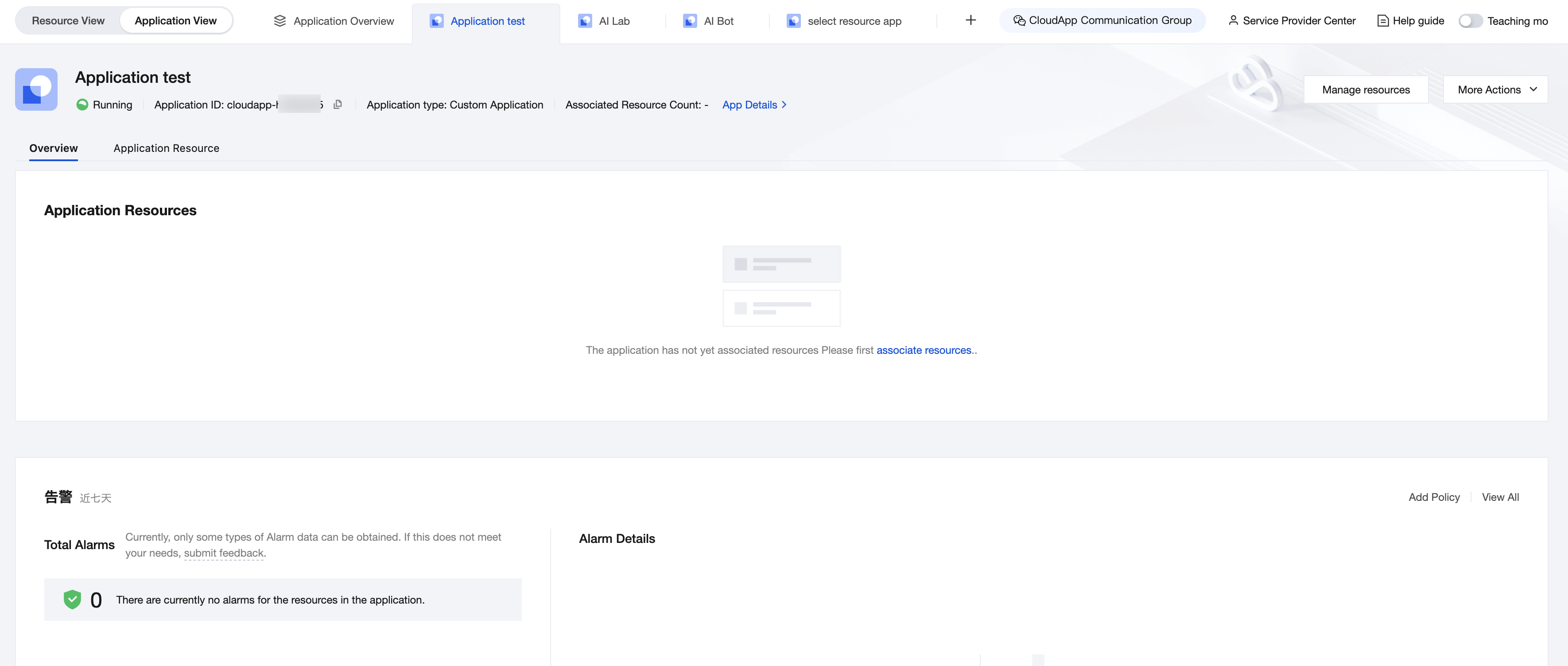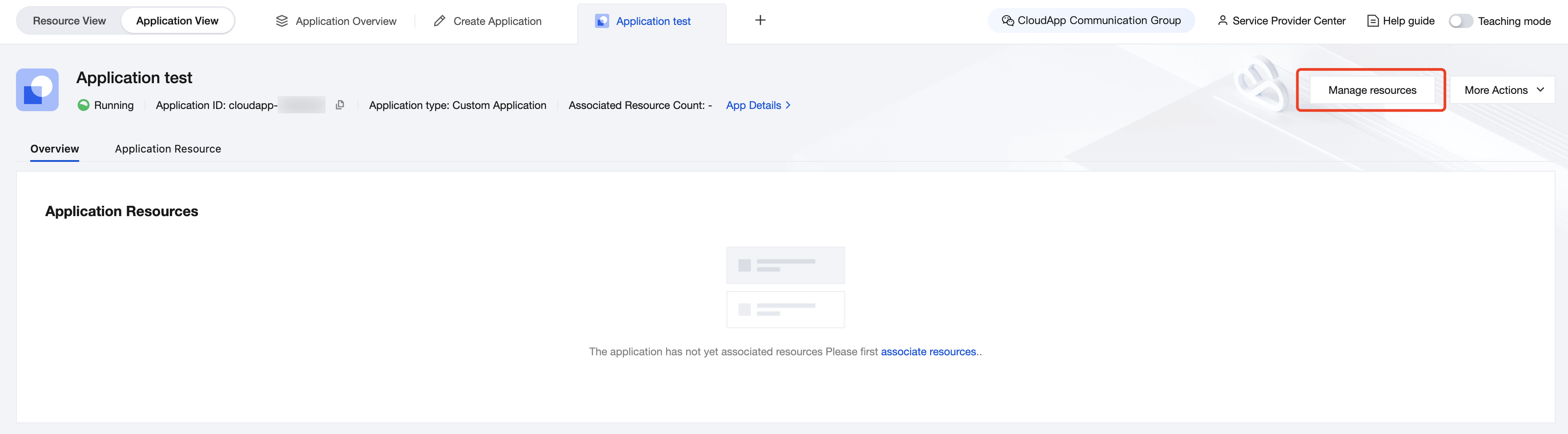アプリ詳細ページの右上隅にあるリソース管理をクリックすると、リソースリストに切り替わります。