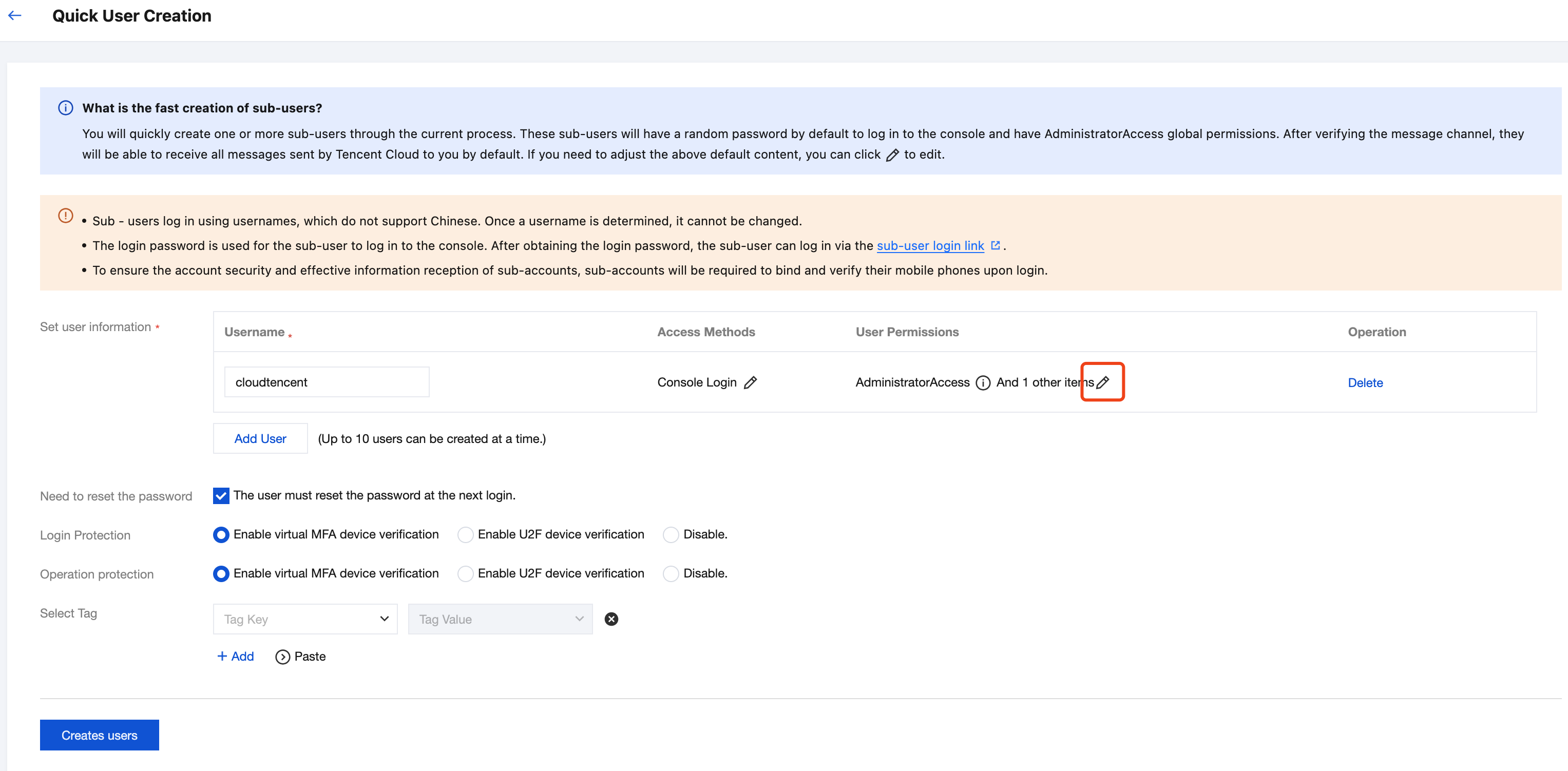 ユーザー権限:QcloudCloudappInstallationAccess プリセットポリシー権限を付与します。