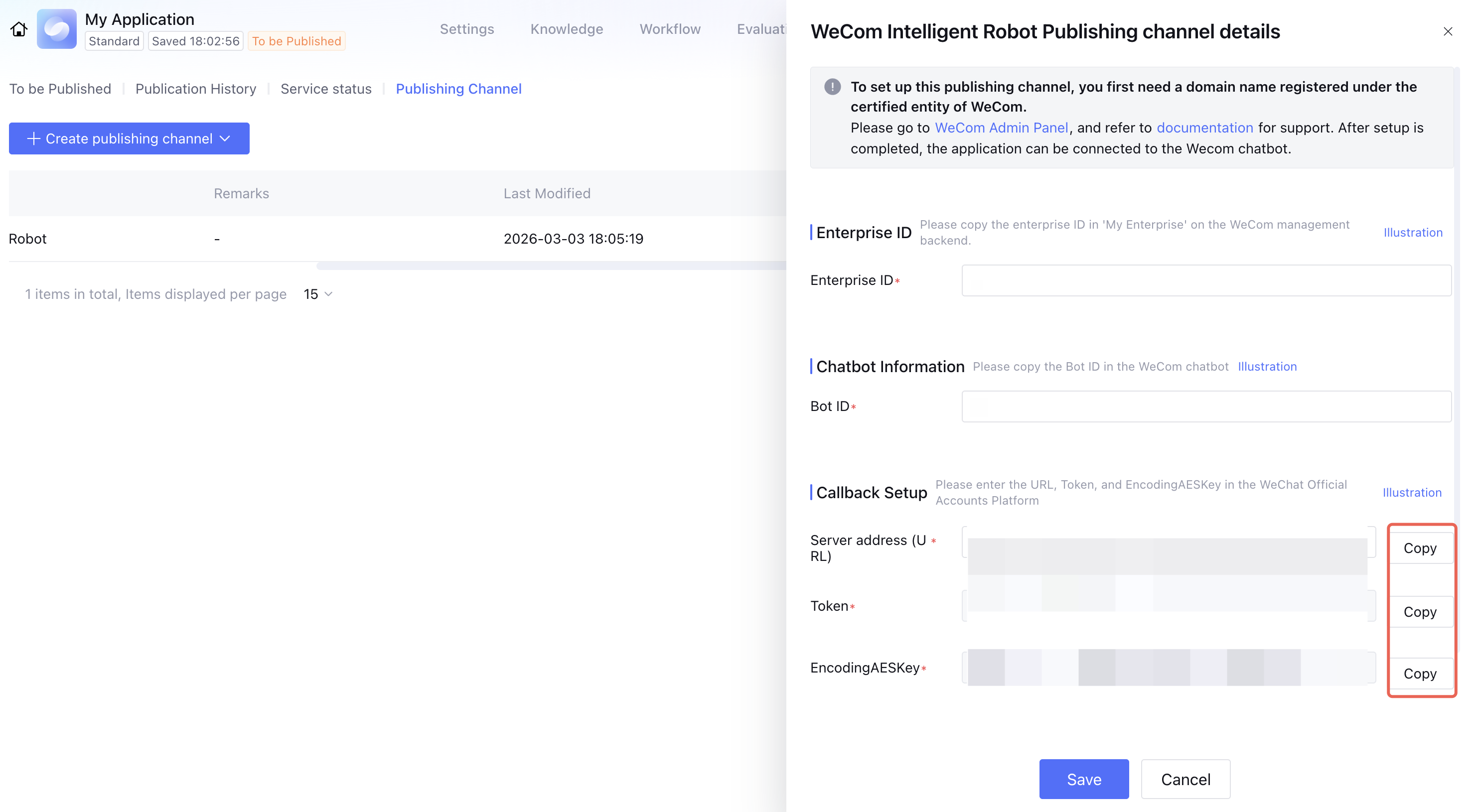 1. In the Intelligent Agent Development Platform, go to the details page of the newly created WeCom Intelligent Bot channel and copy the corresponding parameters.