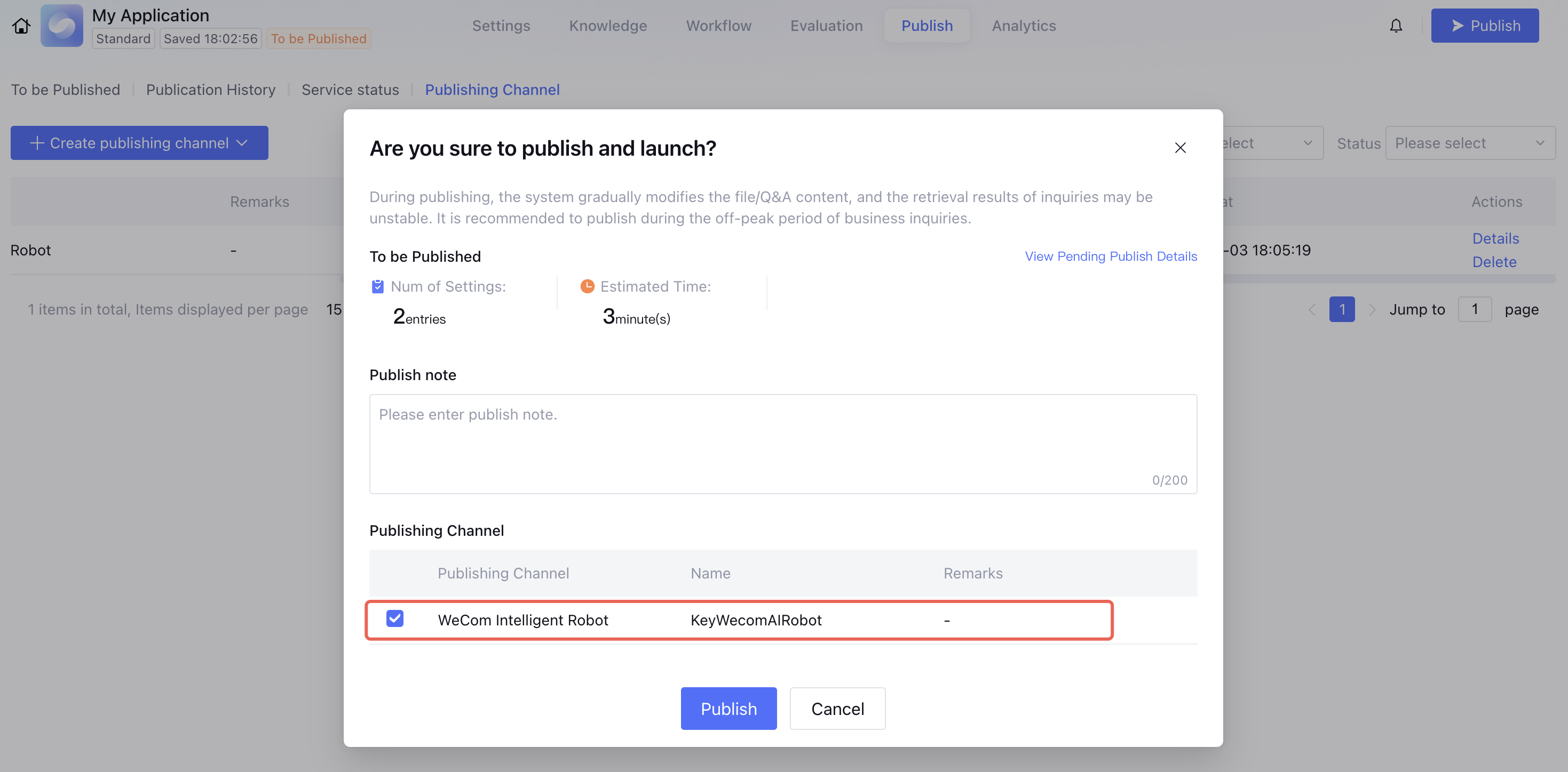 If the app has been published recently and the publish button cannot be clicked, you can modify the content in App settings or Knowledge Management and then publish.