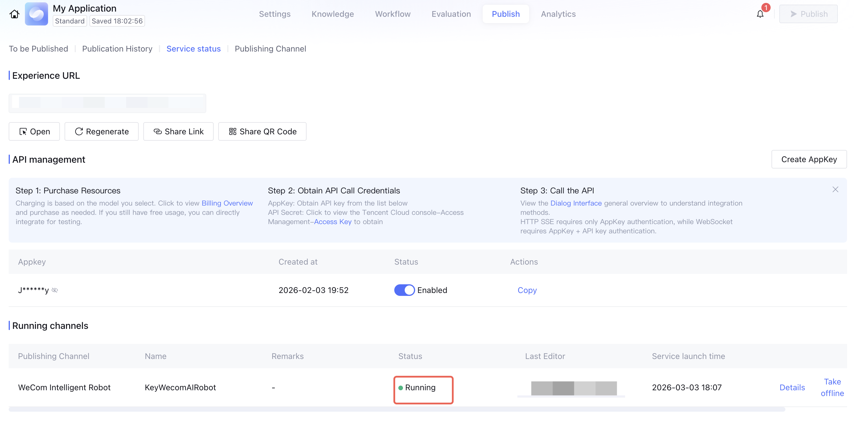 2. After successful publishing, you can view the status of publishing channels in App Publishing > Service Status.