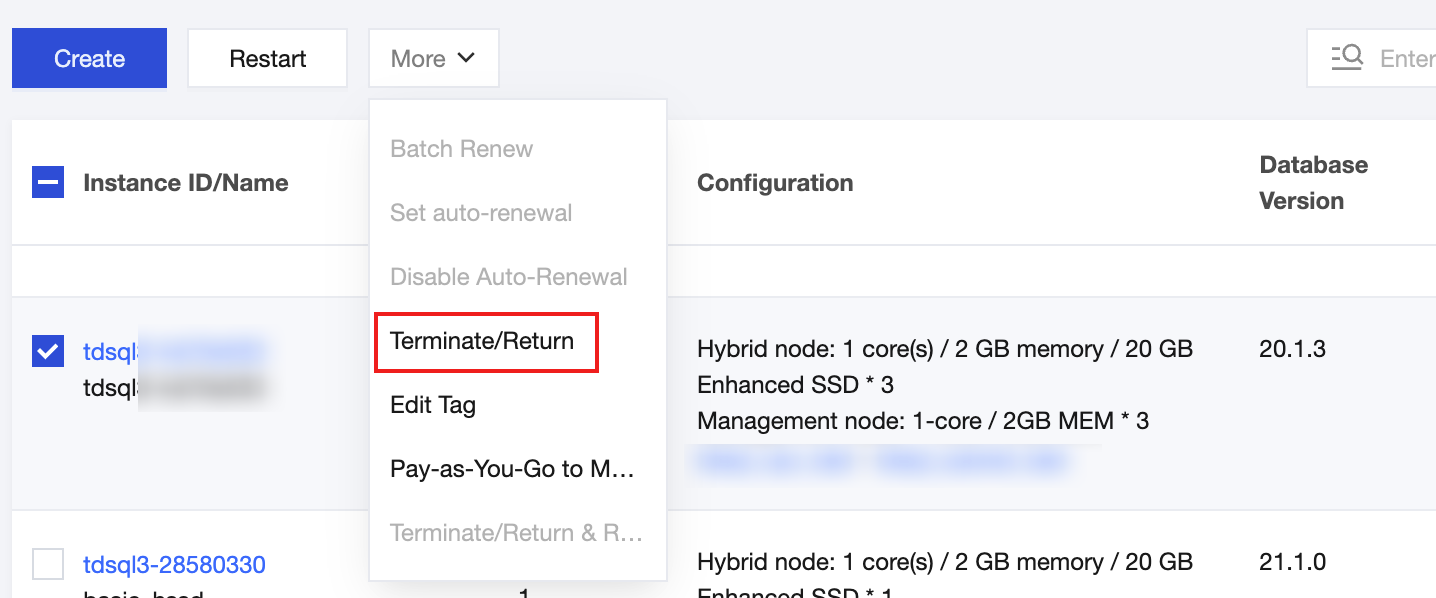 1. Log in to the console, In the Instance List, select the instance(s) by checking the box, then choose More > Terminate/Return in the top operation bar.