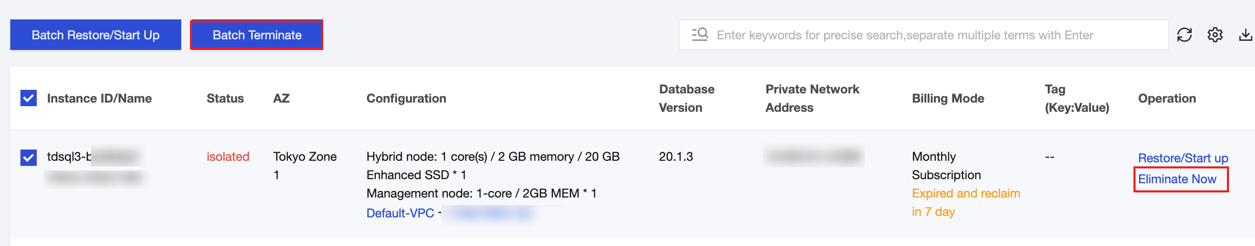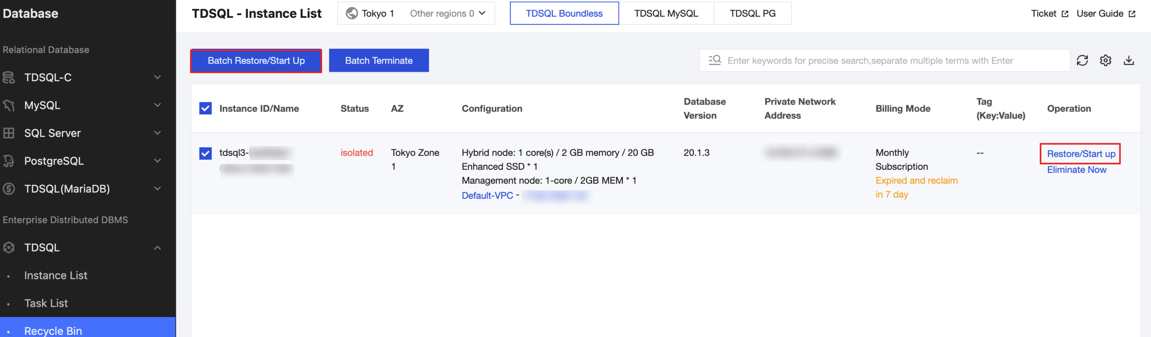 When the instance status enters the "Isolated" state, the instance cannot be accessed. Instances in isolation will be completely destroyed after expiration. Alternatively, you can go to the Recycle Bin to perform immediate terminating and permanently delete the instance.
