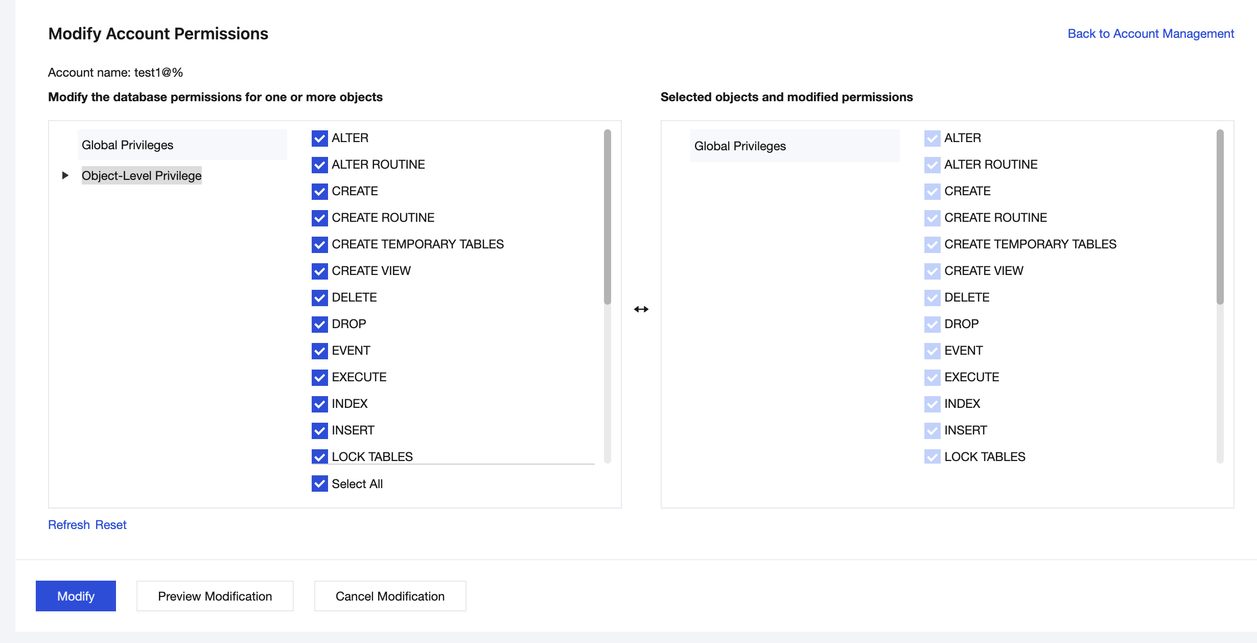 RELOAD | Privilege to reload some configuration files of the system, restart or shutdown the database, and perform other operations. |
