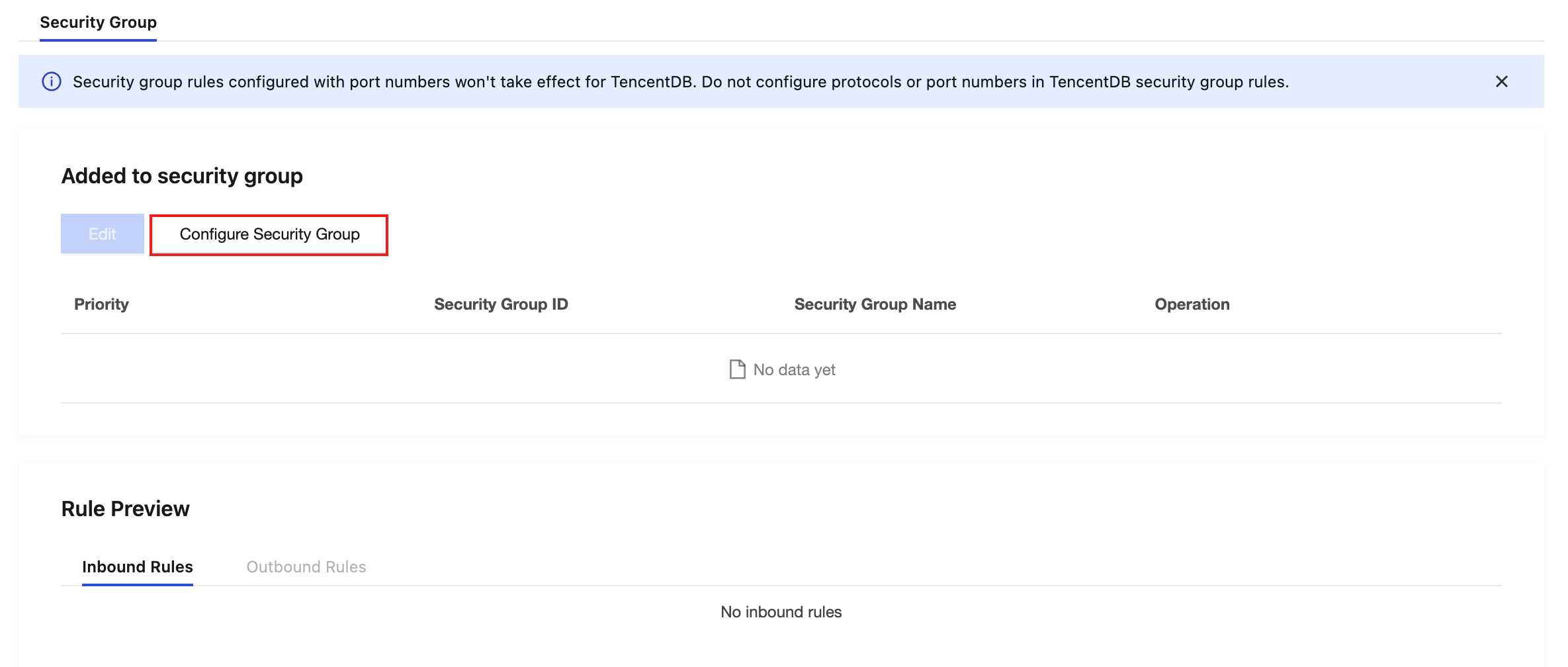 Security Group is a stateful virtual firewall with packet filtering capabilities, used to configure network access control for one or multiple cloud databases. It serves as a critical network security isolation mechanism provided by Tencent Cloud. A security group is a logical grouping where you can add cloud database instances within the same region that share identical network security isolation requirements. Cloud databases share lists of security groups with resources such as CVMs. Rules are matched within security groups based on configurations. For specific rules and limitations, see Security Group Overview. Configure Security Groups for Cloud Database