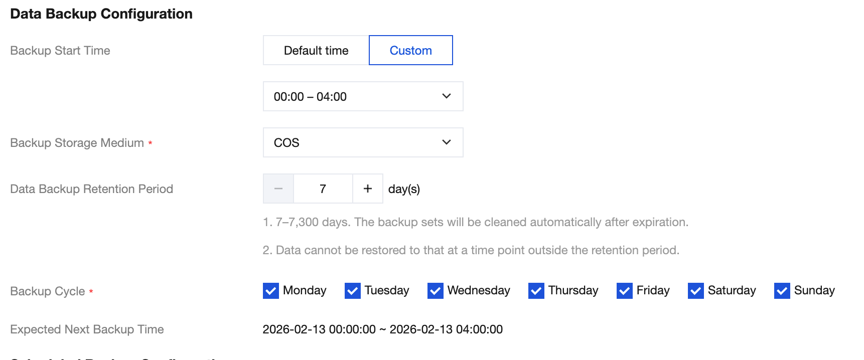 Data Backup Retention Period | The retention period for data backup files is fixed at 7 days, and this setting cannot be modified currently. After the 7-day retention period, the system will automatically delete the backup files, so they cannot be used for data recovery. |