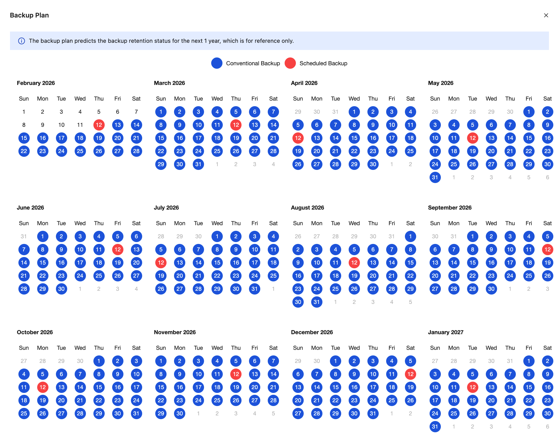 Backup Cycle | The days of the week on which data backups can be initiated. By default, all 7 days from Monday to Sunday are selected, and you can customize the backup schedule. Select at least two days per week on a weekly basis. |