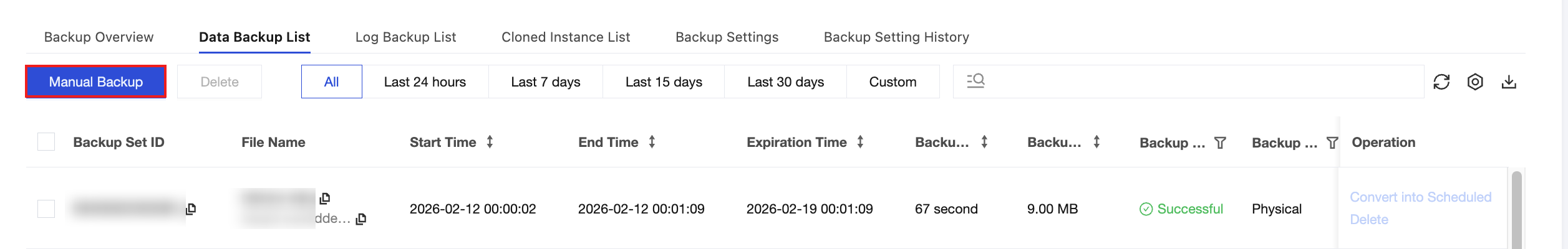 Delete the manual backup set | The system only supports deleting manual backup sets. Note: Once a backup set is deleted, it will no longer be available for backup restoration. Please proceed with caution. To delete a single manual backup set: On the Data Backup List page, locate the row of the backup set to be deleted, and click Delete in the Operation column. Batch delete manual backup sets: 1.1 On the Data Backup List page, select the manual backup sets to be deleted, and click Delete at the top left of the page. 1.2 In the pop-up box, confirm the backup sets to be deleted, and click OK. |