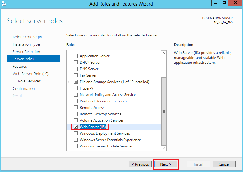 6. 「サーバーの役割の選択」画面で、Web サーバー(IIS)をチェックし、ポップアップウィンドウで機能の追加をクリックします。次の図に示すように: