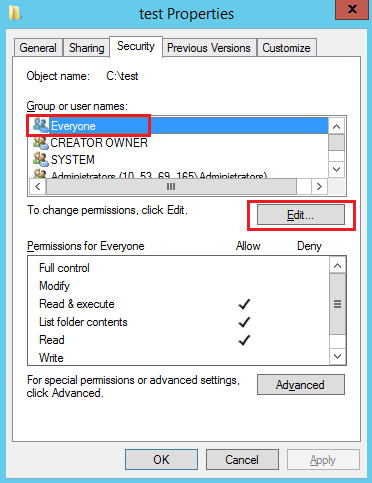 「グループまたはユーザー名」に Everyoneが含まれていない場合は、Everyone Userの追加 を参考してユーザーを追加してください。