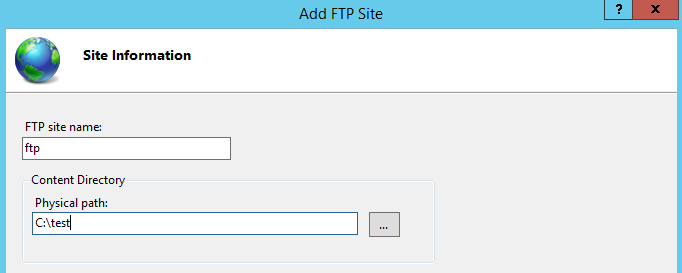 ここではC:\\testファイルを例として、FTPサイトの共有フォルダを設定します。このフォルダには共有する必要のあるファイルtest.txtが含まれています。この例を参照して、新しいフォルダC:\\testとファイルtest.txtを作成することができます。また実際のニーズに応じて、他のフォルダをFTPサイトの共有フォルダとして設定することもできます。