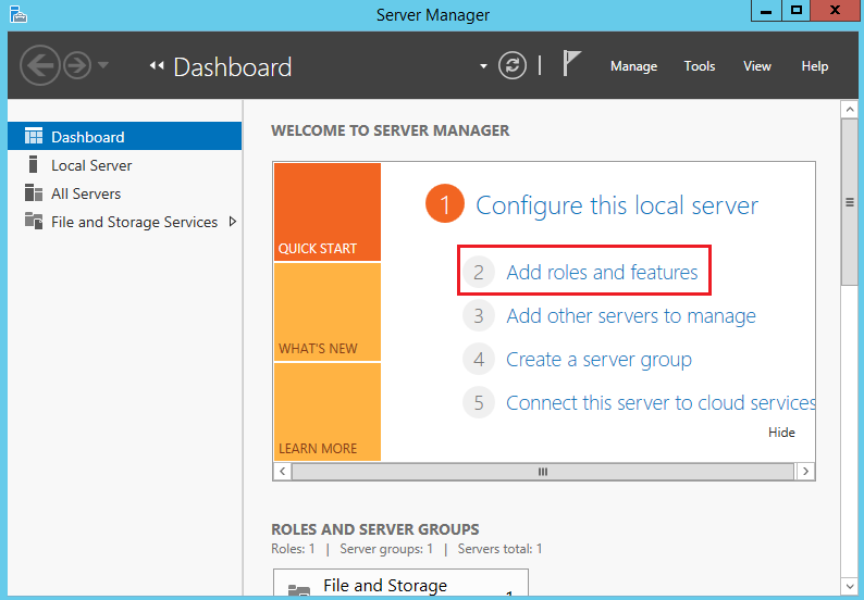 1. OSインターフェースで、 をクリックして、サーバーマネージャーを開きます。 2. 「サーバーマネージャー」画面で、次の図に示すように、役割と機能の追加をクリックします。