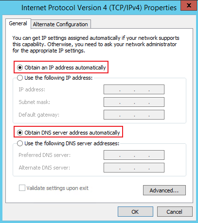5. 以下の図に示すとおり、「インターネットプロトコルバージョン4(TCP/IPv4)」ウィンドウでIPアドレスを自動的に取得するとDNSサーバーのアドレスを自動的に取得するを選択し、【OK】をクリックします。