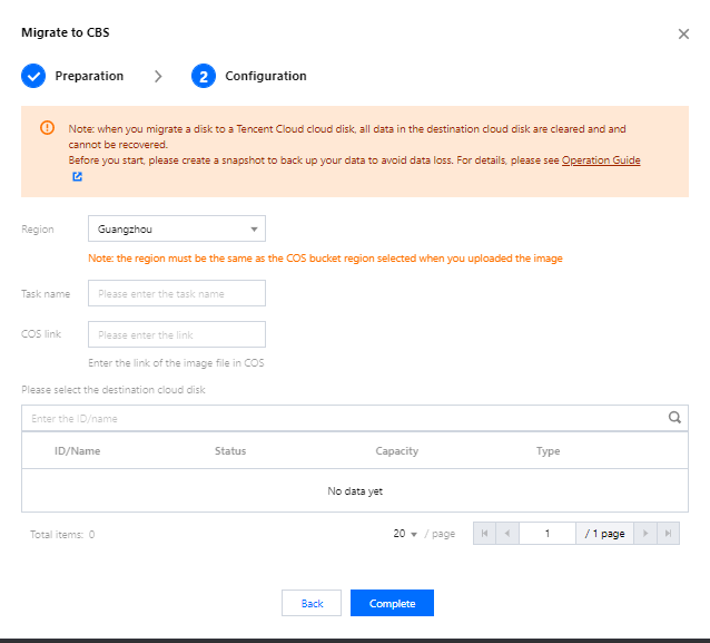 4. リージョンを選択し、タスク名、COS リンク、移行先のCBSインスタンスなどの情報を入力します。下図に示すとおりです。