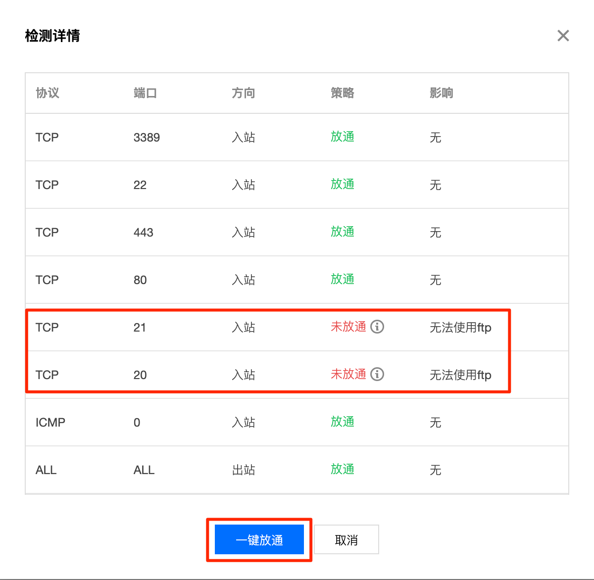 検証ツールを利用して、セキュリティグループのポート設定に問題があることが確認されたら、Open all ports機能を利用してCVMの一般的に使用されるポートをインターネットにを開放したくない、またはリモートログインポートをカスタマイズする必要がある場合、セキュリティグループのインバウンドとアウトバウンドルールをカスタマイズして、リモート接続の問題を解決できます。 詳細の操作については、セキュリティグループルールの変更をご参照ください。